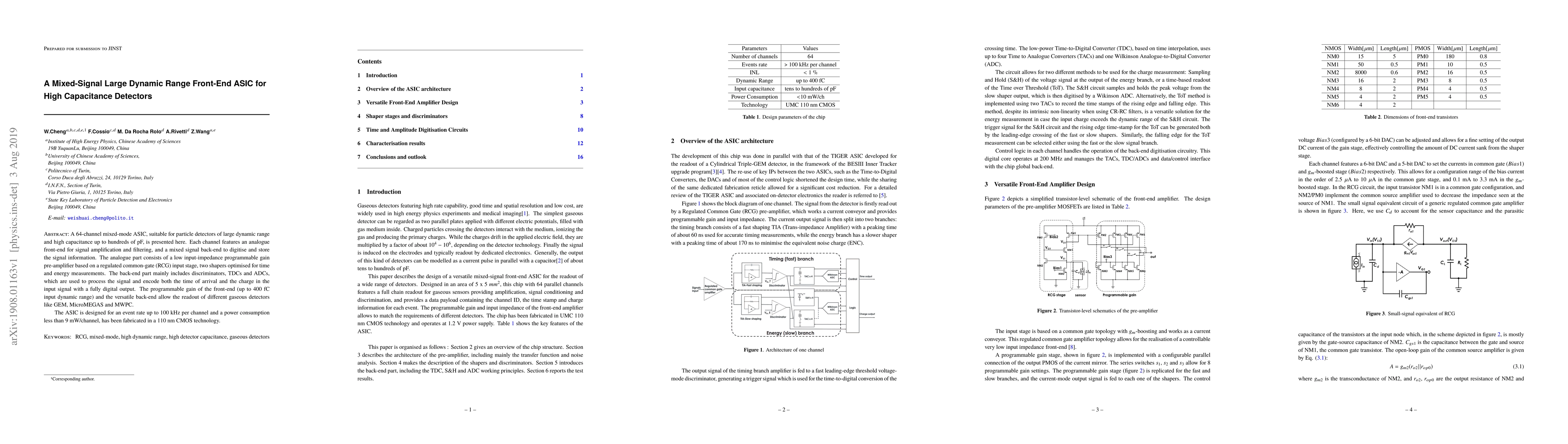 A 64-channel mixed-mode ASIC, suitable for particle detectors of large dynamic range and high capacitance up to hundreds of pF, is presented here. Each channel features an analogue front-end for signal amplification and filtering, and a mixed signal back-end to digitise and store the signal information. The analogue part consists of a low input-impedance programmable gain pre-amplifier based on a regulated common-gate (RCG) input stage, two shapers optimised for time and energy measurements. The back-end part mainly includes discriminators, TDCs and ADCs, which are used to process the signal and encode both the time of arrival and the charge in the input signal with a fully digital output. The programmable gain of the front-end (up to 400 fC input dynamic range) and the versatile back-end allow the readout of different gaseous detectors like GEM, MicroMEGAS and MWPC. The ASIC is designed for an event rate up to 100 kHz per channel and a power consumption less than 9 mW/channel, has been fabricated in a 110 nm CMOS technology.