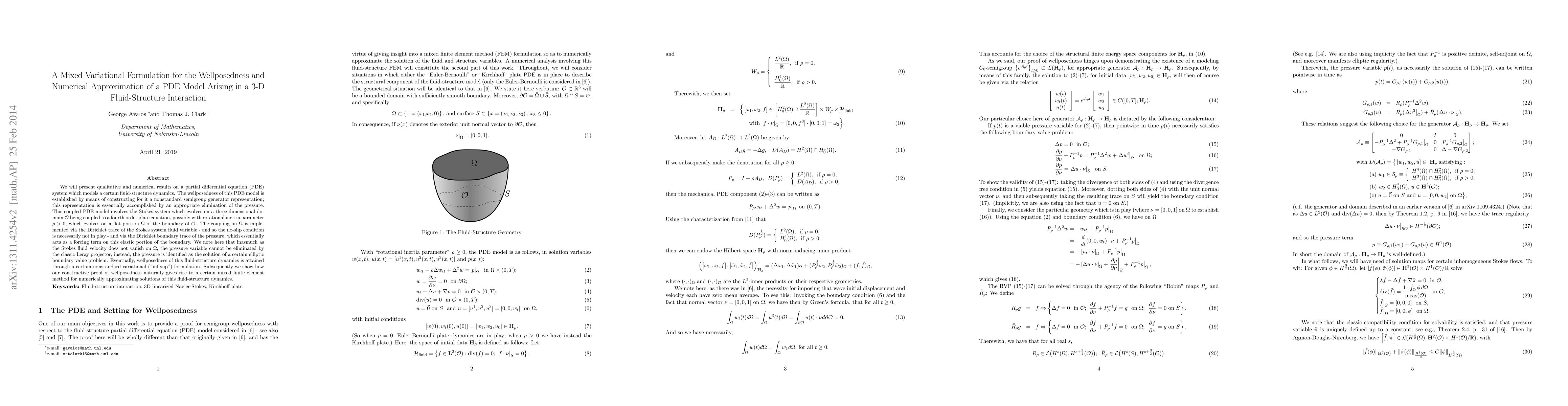 We will present qualitative and numerical results on a partial differential equation (PDE) system which models a certain fluid-structure dynamics. The wellposedness of this PDE model is established by means of constructing for it a nonstandard semigroup generator representation; this representation is essentially accomplished by an appropriate elimination of the pressure. This coupled PDE model involves the Stokes system which evolves on a three dimensional domain $\mathcal{O}$ being coupled to a fourth order plate equation, possibly with rotational inertia parameter $\rho >0$, which evolves on a flat portion $\Omega$ of the boundary of $\mathcal{O}$. The coupling on $\Omega$ is implemented via the Dirichlet trace of the Stokes system fluid variable - and so the no-slip condition is necessarily not in play - and via the Dirichlet boundary trace of the pressure, which essentially acts as a forcing term on this elastic portion of the boundary. We note here that inasmuch as the Stokes fluid velocity does not vanish on $\Omega$, the pressure variable cannot be eliminated by the classic Leray projector; instead, the pressure is identified as the solution of a certain elliptic boundary value problem. Eventually, wellposedness of this fluid-structure dynamics is attained through a certain nonstandard variational (``inf-sup") formulation. Subsequently we show how our constructive proof of wellposedness naturally gives rise to a certain mixed finite element method for numerically approximating solutions of this fluid-structure dynamics.