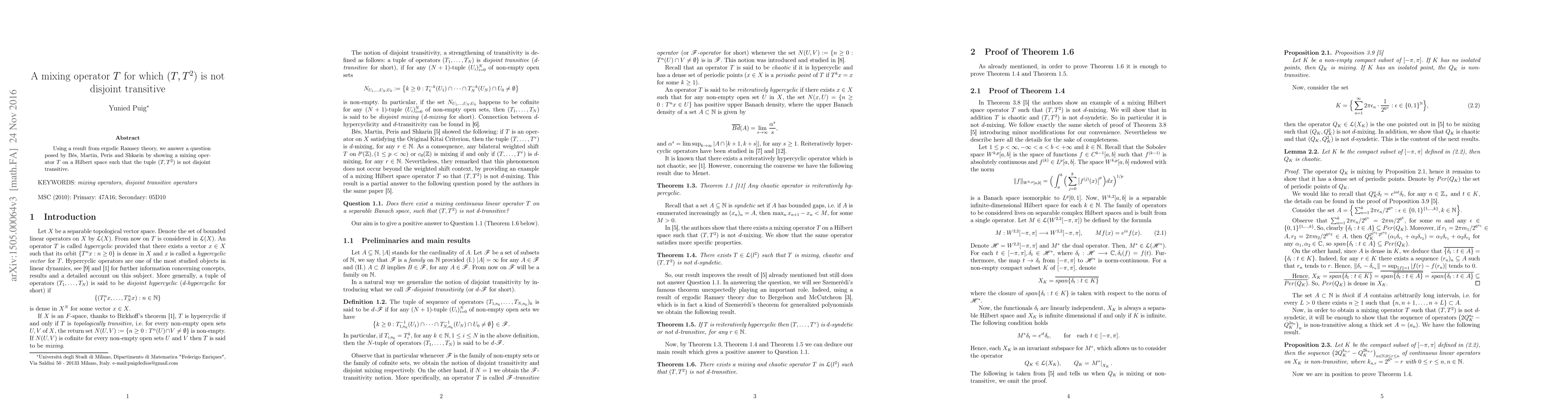 Using a result from ergodic Ramsey theory, we answer a question posed by B\`es, Martin, Peris and Shkarin by showing a mixing operator $T$ on a Hilbert space such that the tuple $(T, T^2)$ is not disjoint transitive.