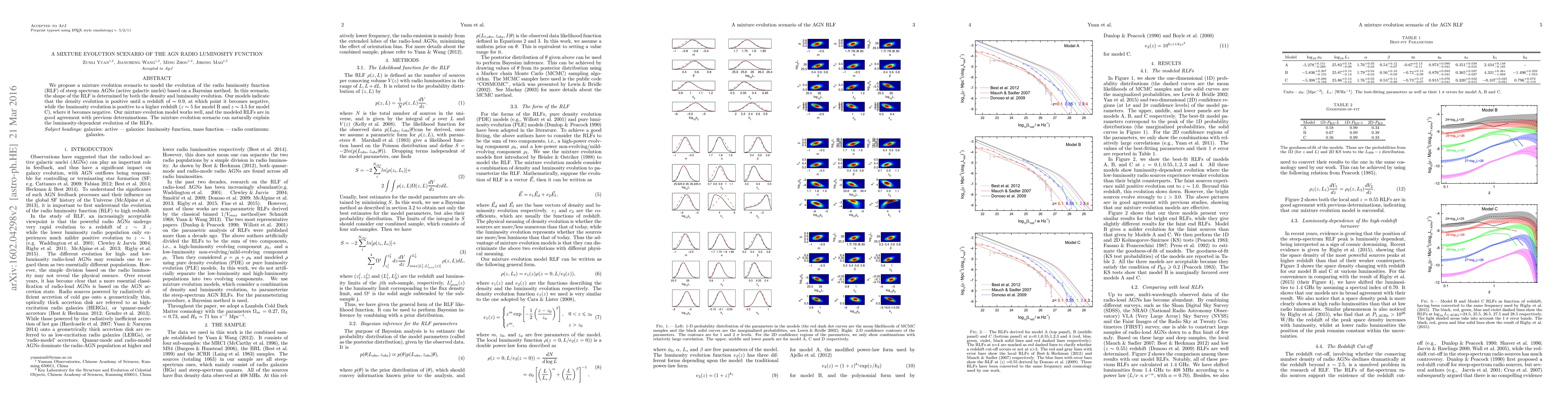 We propose a mixture evolution scenario to model the evolution of the radio luminosity function (RLF) of steep spectrum AGNs (active galactic nuclei) based on a Bayesian method. In this scenario, the shape of the RLF is determined by both the density and luminosity evolution. Our models indicate that the density evolution is positive until a redshift of $\thicksim 0.9$, at which point it becomes negative, while the luminosity evolution is positive to a higher redshift ($z \thicksim 5$ for model B and $z \thicksim 3.5$ for model C), where it becomes negative. Our mixture evolution model works well, and the modeled RLFs are in good agreement with previous determinations. The mixture evolution scenario can naturally explain the luminosity-dependent evolution of the RLFs.