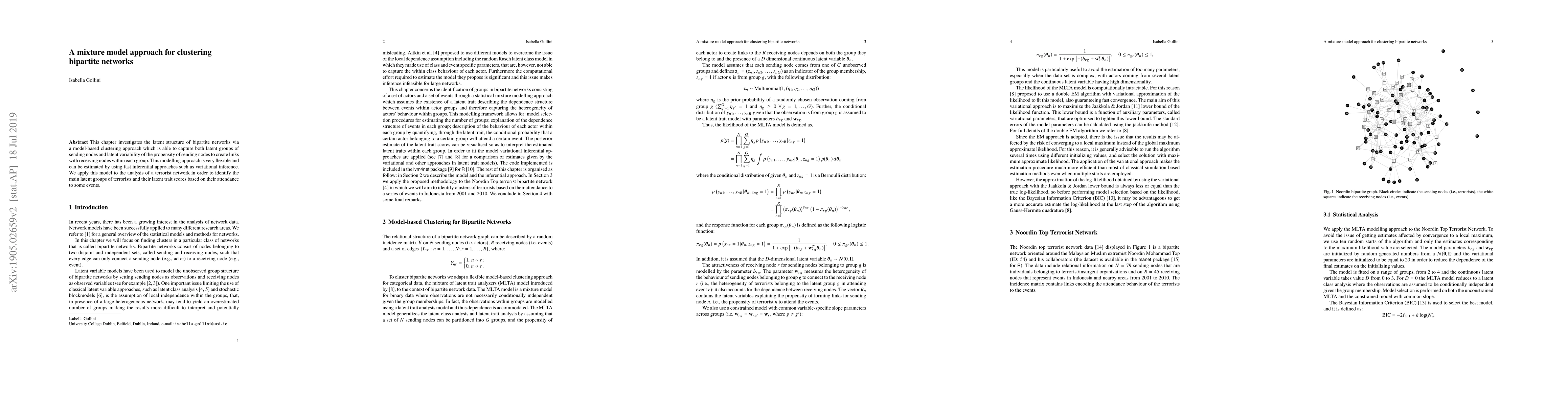 This paper proposes a mixture model for clustering bipartite networks, capturing latent groups and link propensity variability, and demonstrates its flexibility using variational inference. The model is applied to a terrorist network to identify latent groups and trait scores based on event attendance.