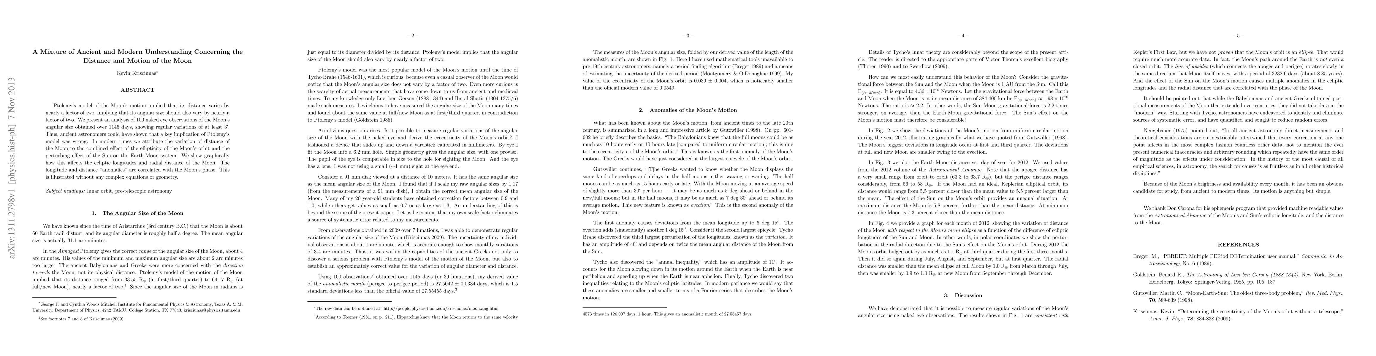 The paper presents an analysis of 100 naked-eye Moon angular size observations over 1145 days, revealing regular variations of at least 3 arc minutes. This contradicts Ptolemy's model, which implied significant distance and size variations, suggesting ancient astronomers could have disproved it. Modern understanding attributes these variations to the elliptical Moon orbit and Sun's perturbation effect on the Earth-Moon system, visually demonstrated without complex equations.