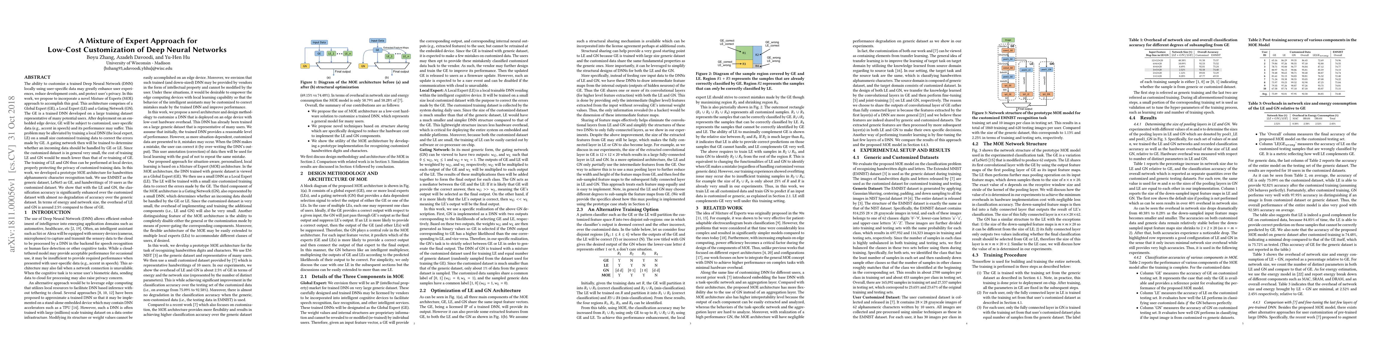 The ability to customize a trained Deep Neural Network (DNN) locally using user-specific data may greatly enhance user experiences, reduce development costs, and protect user's privacy. In this work, we propose to incorporate a novel Mixture of Experts (MOE) approach to accomplish this goal. This architecture comprises of a Global Expert (GE), a Local Expert (LE) and a Gating Network (GN). The GE is a trained DNN developed on a large training dataset representative of many potential users. After deployment on an embedded edge device, GE will be subject to customized, user-specific data (e.g., accent in speech) and its performance may suffer. This problem may be alleviated by training a local DNN (the local expert, LE) on a small size customized training data to correct the errors made by GE. A gating network then will be trained to determine whether an incoming data should be handled by GE or LE. Since the customized dataset is in general very small, the cost of training LE and GN would be much lower than that of re-training of GE. The training of LE and GN thus can be performed at local device, properly protecting the privacy of customized training data. In this work, we developed a prototype MOE architecture for handwritten alphanumeric character recognition task. We use EMNIST as the generic dataset, LeNet5 as GE, and handwritings of 10 users as the customized dataset. We show that with the LE and GN, the classification accuracy is significantly enhanced over the customized dataset with almost no degradation of accuracy over the generic dataset. In terms of energy and network size, the overhead of LE and GN is around 2.5% compared to those of GE.