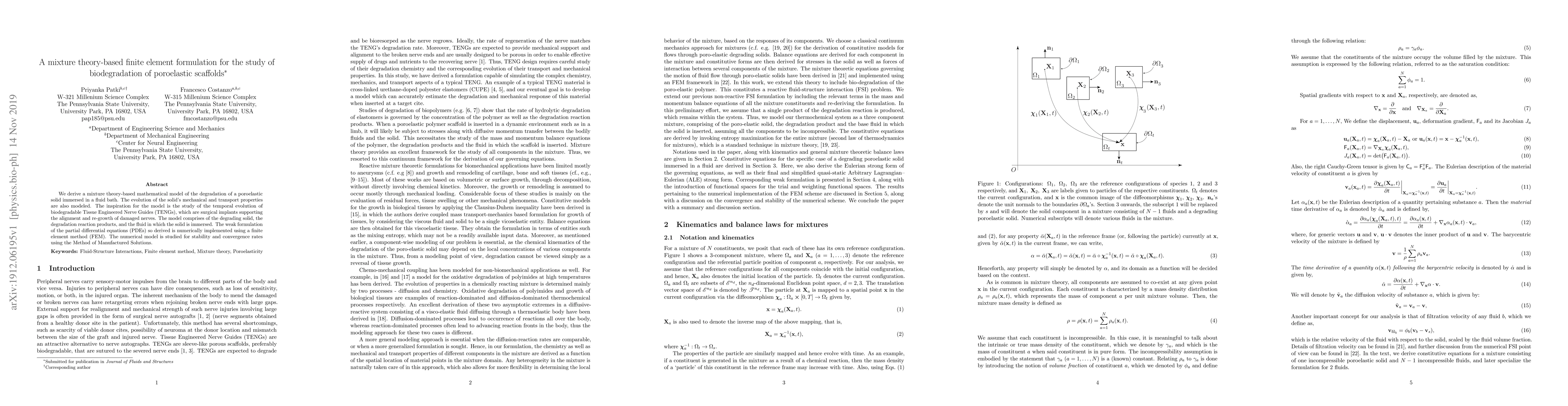 This paper develops a mixture theory-based finite element model for simulating the biodegradation of poroelastic scaffolds in a fluid environment, focusing on the temporal evolution of Tissue Engineered Nerve Guides (TENGs). The model numerically solves the derived partial differential equations using the Finite Element Method and validates the model's stability and convergence.