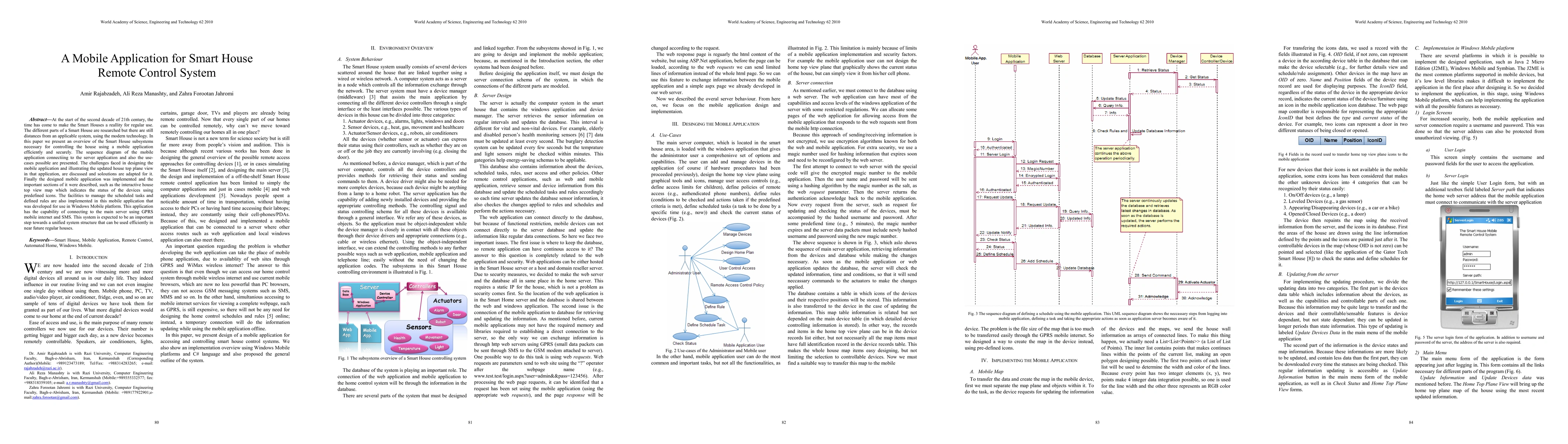 At the start of the second decade of 21th century, the time has come to make the Smart Houses a reality for regular use. The different parts of a Smart House are researched but there are still distances from an applicable system, using the modern technology. In this paper we present an overview of the Smart House subsystems necessary for controlling the house using a mobile application efficiently and securely. The sequence diagram of the mobile application connecting to the server application and also the use-cases possible are presented. The challenges faced in designing the mobile application and illustrating the updated house top plane view in that application, are discussed and solutions are adapted for it. Finally the designed mobile application was implemented and the important sections of it were described, such as the interactive house top view map which indicates the status of the devices using predefined icons. The facilities to manage the scheduled tasks and defined rules are also implemented in this mobile application that was developed for use in Windows Mobile platform. This application has the capability of connecting to the main server using GPRS mobile internet and SMS. This system is expected to be an important step towards a unified system structure that can be used efficiently in near future regular houses.