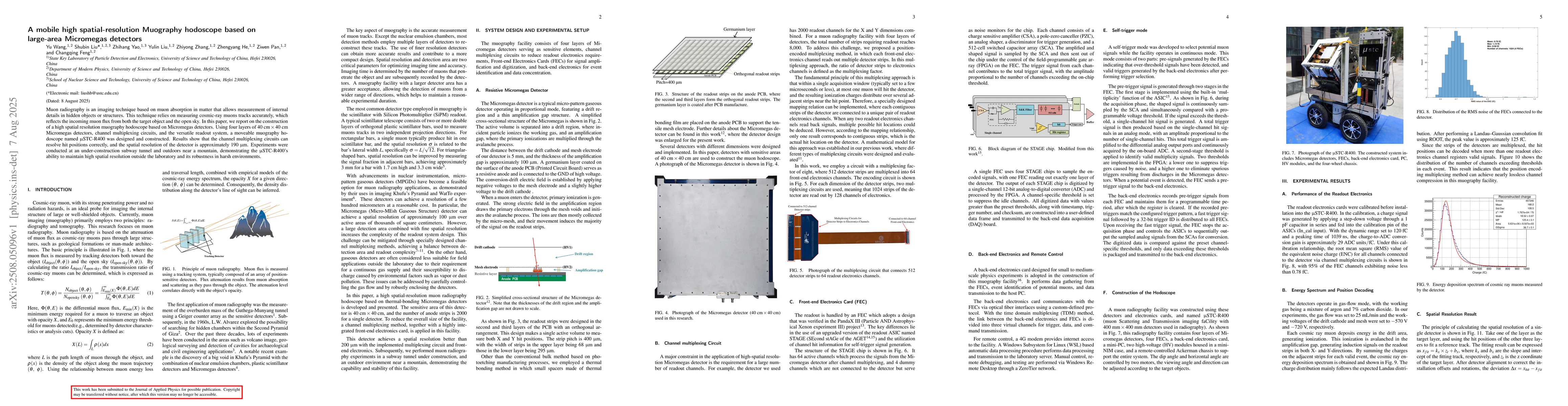 Muon radiography is an imaging technique based on muon absorption in matter that allows measurement of internal details in hidden objects or structures. This technique relies on measuring cosmic-ray muons tracks accurately, which reflects the incoming muon flux from both the target object and the open sky. In this paper, we report on the construction of a high spatial resolution muography hodoscope based on Micromegas detectors. Using four layers of 40cm {\times} 40 cm Micromegas detectors, channel multiplexing circuits, and the versatile readout system, a moveable muography hodoscope named {\mu}STC-R400 was designed and constructed. Results show that the channel multiplexing circuits can resolve hit positions correctly, and the spatial resolution of the detector is approximately 190 {\mu}m. Experiments were conducted at an under-construction subway tunnel and outdoors near a mountain, demonstrating the {\mu}STC-R400's ability to maintain high spatial resolution outside the laboratory and its robustness in harsh environments.