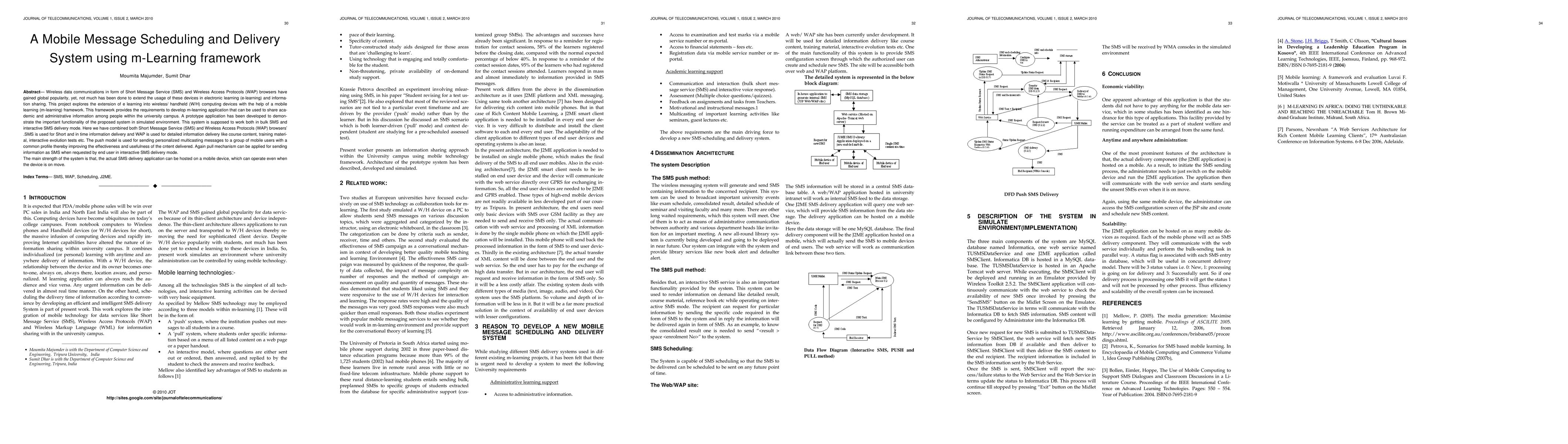Wireless data communications in form of Short Message Service (SMS) and Wireless Access Protocols (WAP) browsers have gained global popularity, yet, not much has been done to extend the usage of these devices in electronic learning (e-learning) and information sharing. This project explores the extension of e learning into wireless/ handheld (W/H) computing devices with the help of a mobile learning (m-learning) framework. This framework provides the requirements to develop m-learning application that can be used to share academic and administrative information among people within the university campus. A prototype application has been developed to demonstrate the important functionality of the proposed system in simulated environment. This system is supposed to work both in bulk SMS and interactive SMS delivery mode. Here we have combined both Short Message Service (SMS) and Wireless Access Protocols (WAP) browsers. SMS is used for Short and in time information delivery and WAP is used for detailed information delivery like course content, training material, interactive evolution tests etc. The push model is used for sending personalized multicasting messages to a group of mobile users with a common profile thereby improving the effectiveness and usefulness of the cntent delivered. Again pull mechanism can be applied for sending information as SMS when requested by end user in interactive SMS delivery mode. The main strength of the system is that, the actual SMS delivery application can be hosted on a mobile device, which can operate even when the device is on move.
