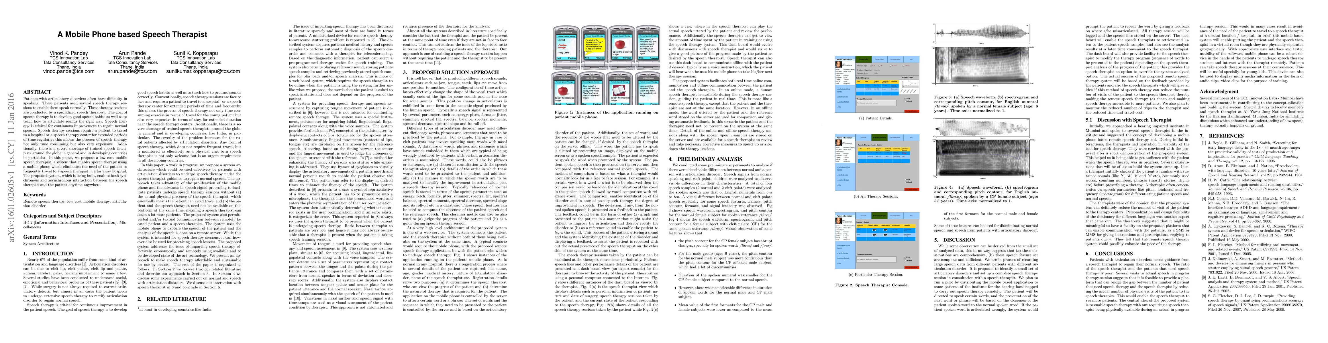 Patients with articulatory disorders often have difficulty in speaking. These patients need several speech therapy sessions to enable them speak normally. These therapy sessions are conducted by a specialized speech therapist. The goal of speech therapy is to develop good speech habits as well as to teach how to articulate sounds the right way. Speech therapy is critical for continuous improvement to regain normal speech. Speech therapy sessions require a patient to travel to a hospital or a speech therapy center for extended periods of time regularly; this makes the process of speech therapy not only time consuming but also very expensive. Additionally, there is a severe shortage of trained speech therapists around the globe in general and in developing countries in particular. In this paper, we propose a low cost mobile speech therapist, a system that enables speech therapy using a mobile phone which eliminates the need of the patient to frequently travel to a speech therapist in a far away hospital. The proposed system, which is being built, enables both synchronous and asynchronous interaction between the speech therapist and the patient anytime anywhere