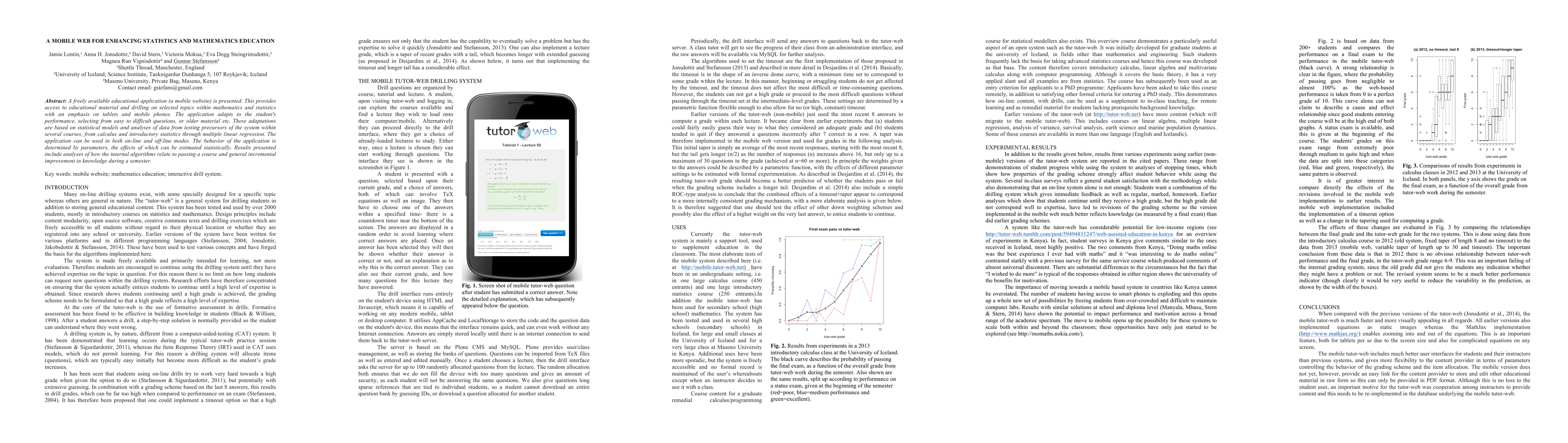 A freely available educational application (a mobile website) is presented. This provides access to educational material and drilling on selected topics within mathematics and statistics with an emphasis on tablets and mobile phones. The application adapts to the student's performance, selecting from easy to difficult questions, or older material etc. These adaptations are based on statistical models and analyses of data from testing precursors of the system within several courses, from calculus and introductory statistics through multiple linear regression. The application can be used in both on-line and off-line modes. The behavior of the application is determined by parameters, the effects of which can be estimated statistically. Results presented include analyses of how the internal algorithms relate to passing a course and general incremental improvement in knowledge during a semester.
