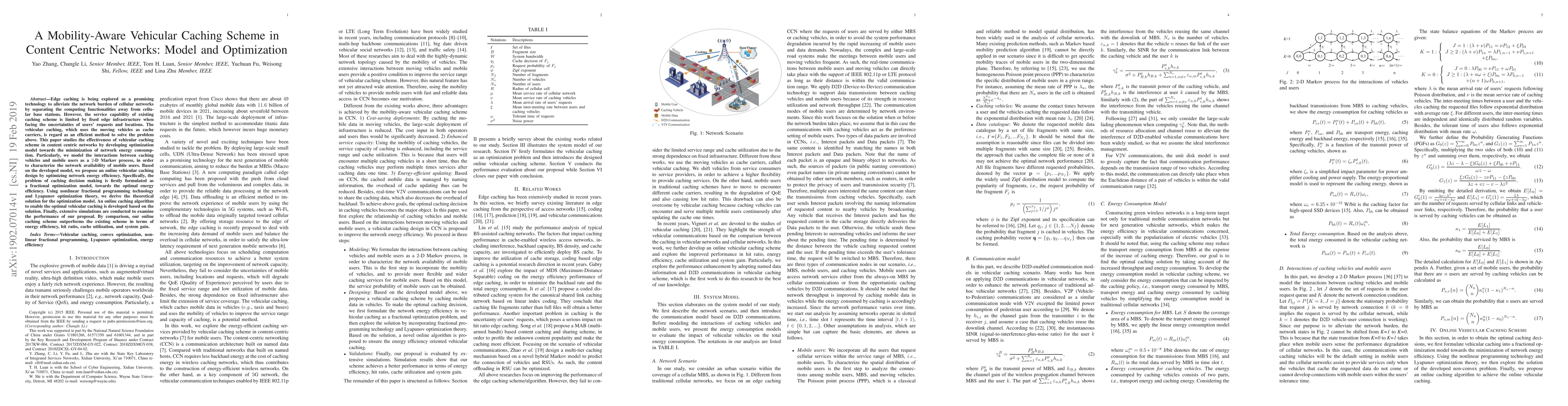 This paper proposes a mobility-aware vehicular caching scheme in content centric networks to optimize network energy consumption. It develops an optimization model and an online caching algorithm based on a 2-D Markov process, achieving better energy efficiency, hit ratio, cache utilization, and system gain compared to existing schemes.