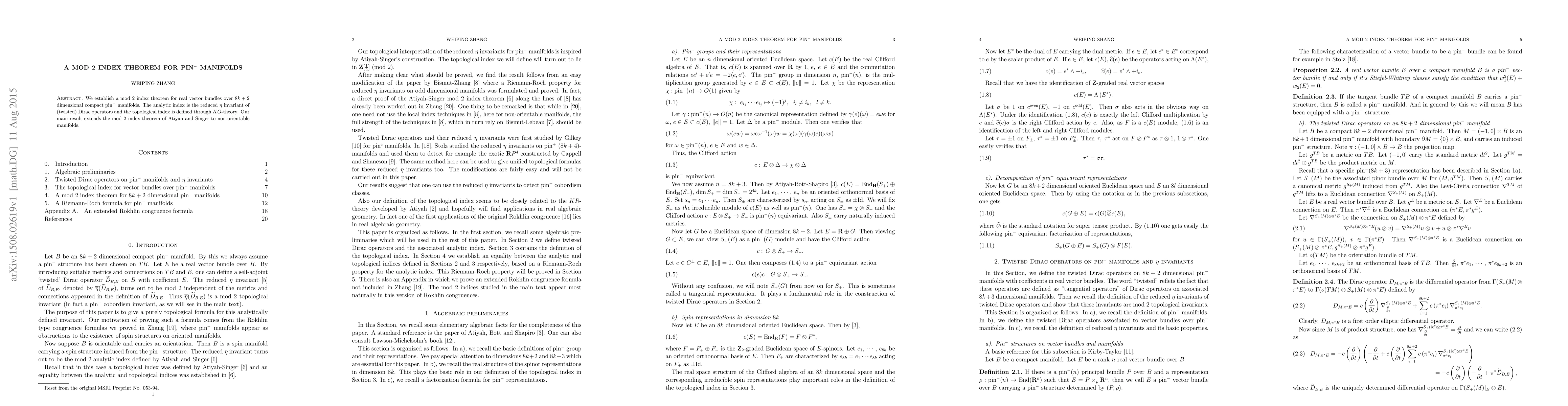 We establish a mod 2 index theorem for real vector bundles over 8k+2 dimensional compact pin$^-$ manifolds. The analytic index is the reduced $\eta$ invariant of (twisted) Dirac operators and the topological index is defined through $KO$-theory. Our main result extends the mod 2 index theorem of Atiyan and Singer to non-orientable manifolds.