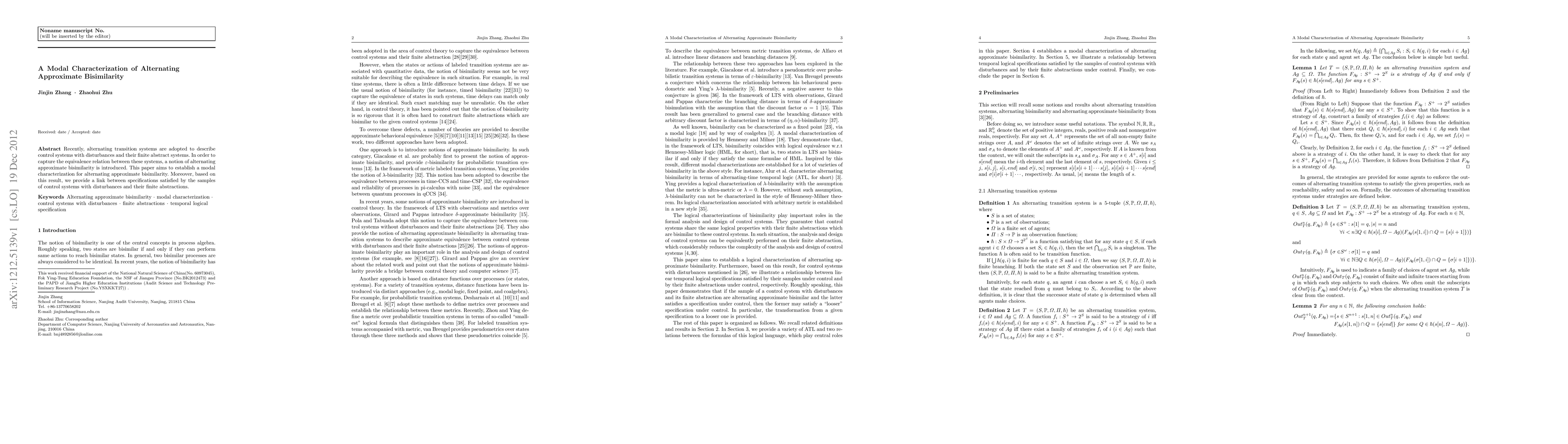 This paper introduces a modal characterization for alternating approximate bisimilarity in control systems with disturbances, establishing a connection between specifications in the original systems and their finite abstractions. The result provides a formal equivalence relation for these systems.