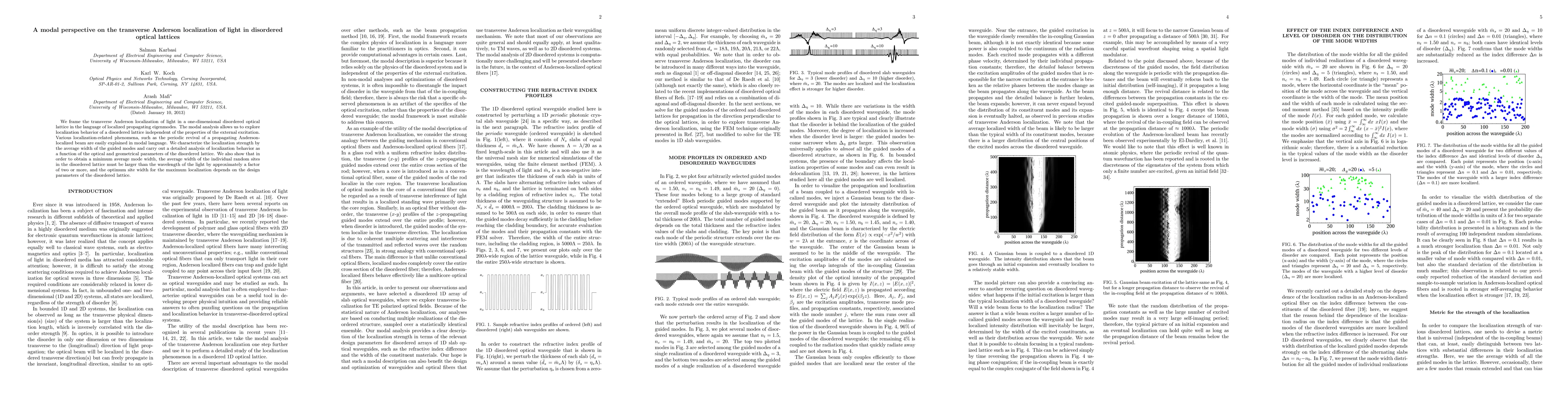 This study explores transverse Anderson localization of light in disordered optical lattices through modal analysis, revealing how localization strength correlates with guided mode width. It concludes that optimal localization requires lattice site widths exceeding the light wavelength by a factor of two or more, with the best site width depending on lattice design parameters.