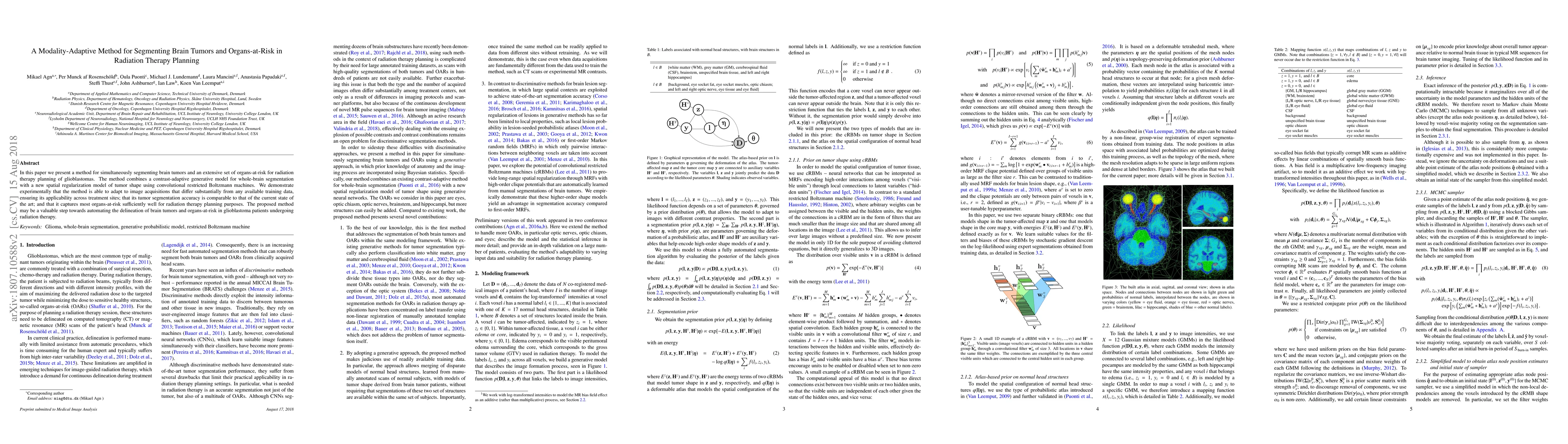 This paper introduces a modality-adaptive method for segmenting brain tumors and organs-at-risk in radiation therapy planning, combining a contrast-adaptive generative model with spatial regularization using convolutional restricted Boltzmann machines. The method demonstrates high adaptability, comparable tumor segmentation accuracy, and sufficient organ-at-risk delineation for treatment planning.