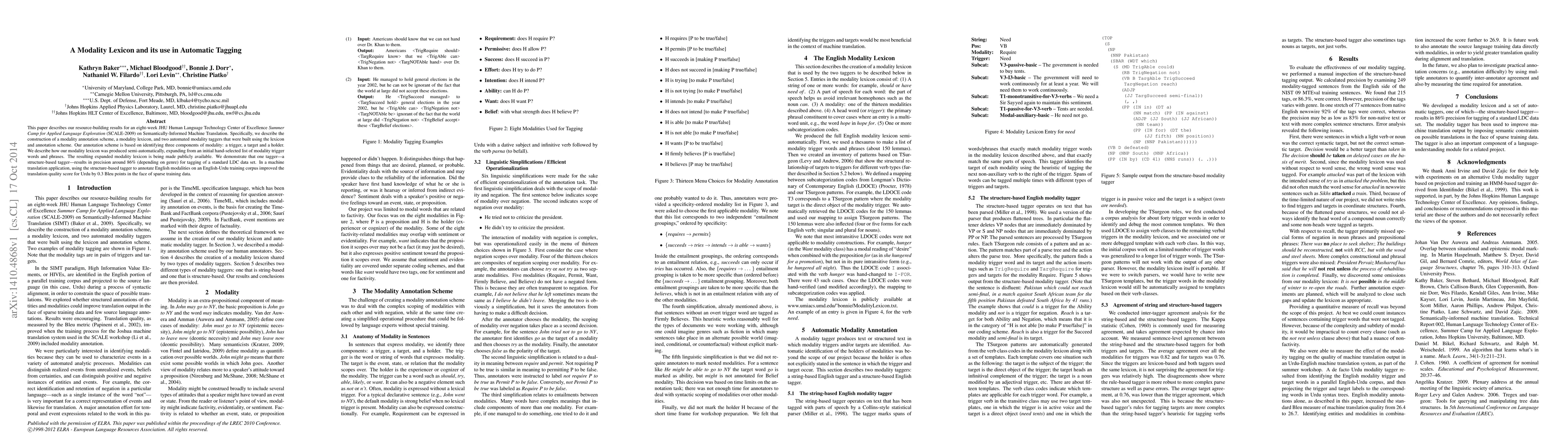 This paper details the creation of a modality lexicon and automated taggers for identifying modality components in text, showing improved translation quality in a machine translation application. The modality lexicon, expanded semi-automatically, achieved tagging precision around 86% on a standard dataset.