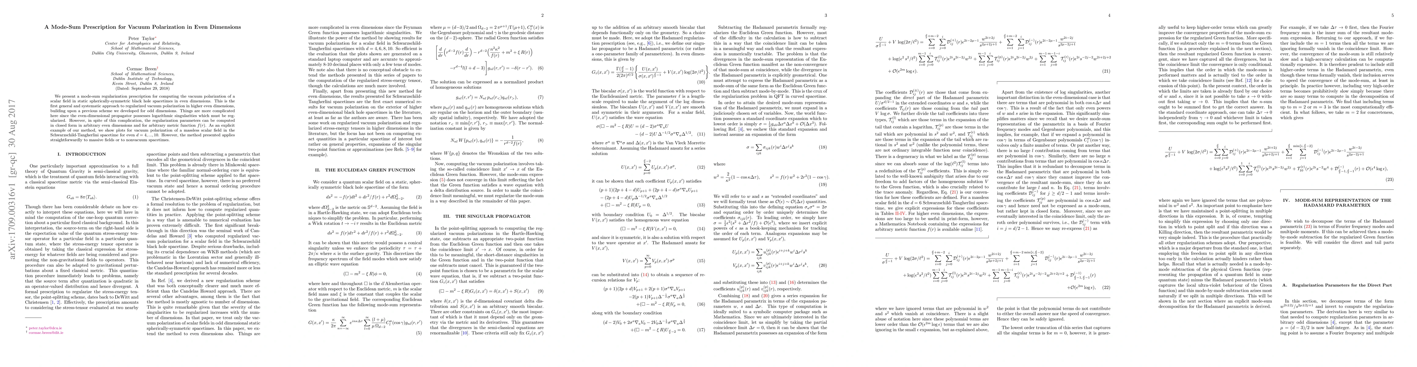 This paper introduces a mode-sum regularization method to compute vacuum polarization in even-dimensional black hole spacetimes, addressing the unique challenges of logarithmic singularities. The method provides closed-form solutions for arbitrary dimensions and metric functions, demonstrated through examples in even-dimensional Schwarzschild-Tangherlini spacetimes.