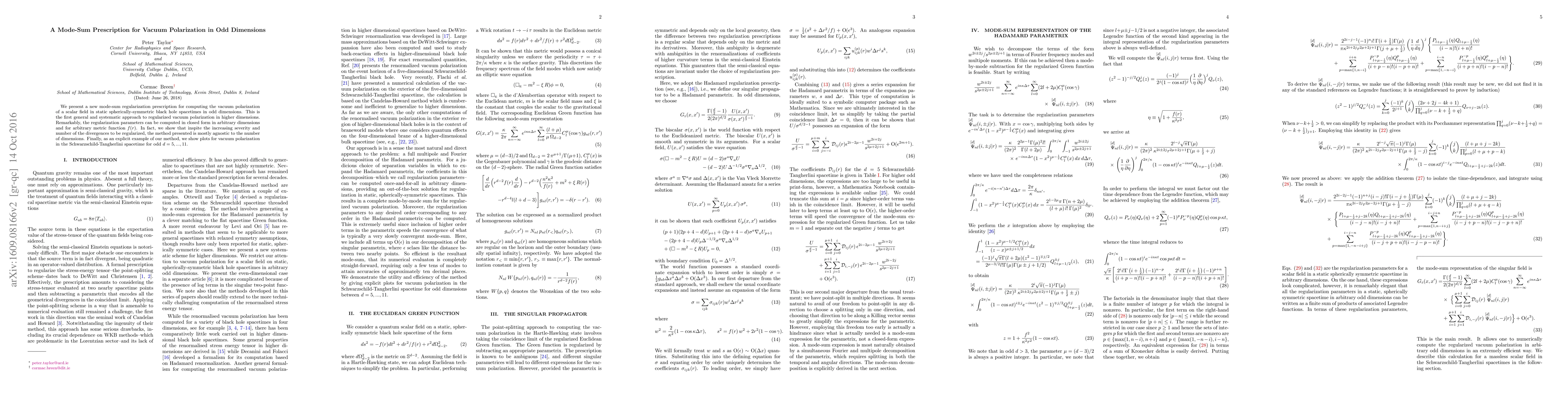 This paper introduces a novel mode-sum regularization method for calculating vacuum polarization in odd-dimensional black hole spacetimes, providing a systematic approach applicable across dimensions. The method yields closed-form regularization parameters and is demonstrated through examples in the Schwarzschild-Tangherlini spacetime for dimensions $d=5$ to $11$.
