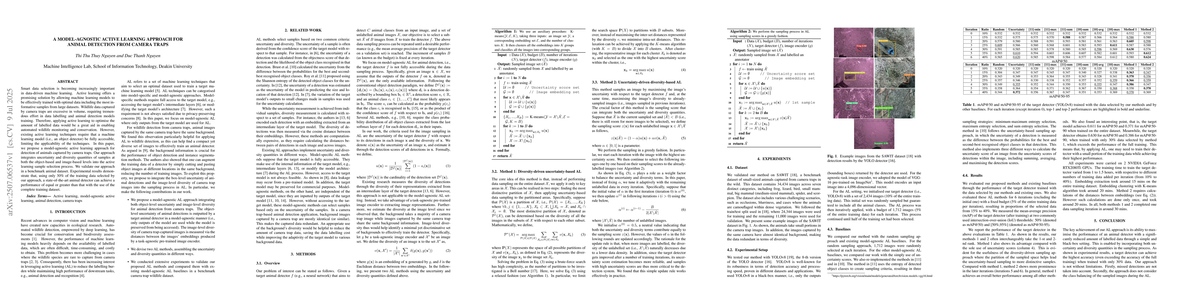 Smart data selection is becoming increasingly important in data-driven machine learning. Active learning offers a promising solution by allowing machine learning models to be effectively trained with optimal data including the most informative samples from large datasets. Wildlife data captured by camera traps are excessive in volume, requiring tremendous effort in data labelling and animal detection models training. Therefore, applying active learning to optimise the amount of labelled data would be a great aid in enabling automated wildlife monitoring and conservation. However, existing active learning techniques require that a machine learning model (i.e., an object detector) be fully accessible, limiting the applicability of the techniques. In this paper, we propose a model-agnostic active learning approach for detection of animals captured by camera traps. Our approach integrates uncertainty and diversity quantities of samples at both the object-based and image-based levels into the active learning sample selection process. We validate our approach in a benchmark animal dataset. Experimental results demonstrate that, using only 30% of the training data selected by our approach, a state-of-the-art animal detector can achieve a performance of equal or greater than that with the use of the complete training dataset.