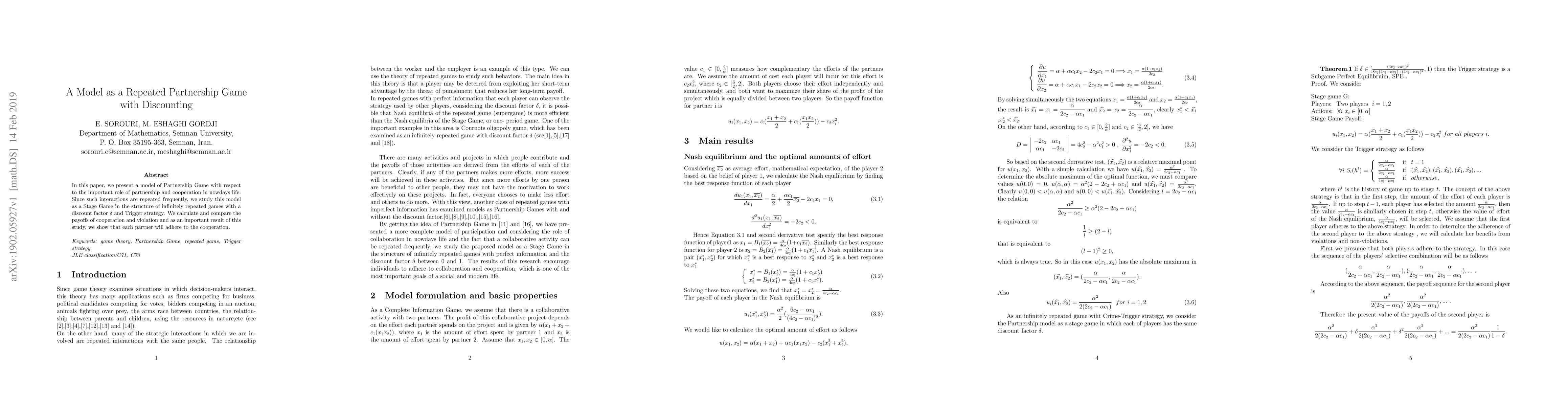 This paper models partnership and cooperation as a repeated game with a discount factor, analyzing the Trigger strategy to show that partners will prefer cooperation over violation, leading to sustained mutual benefits.