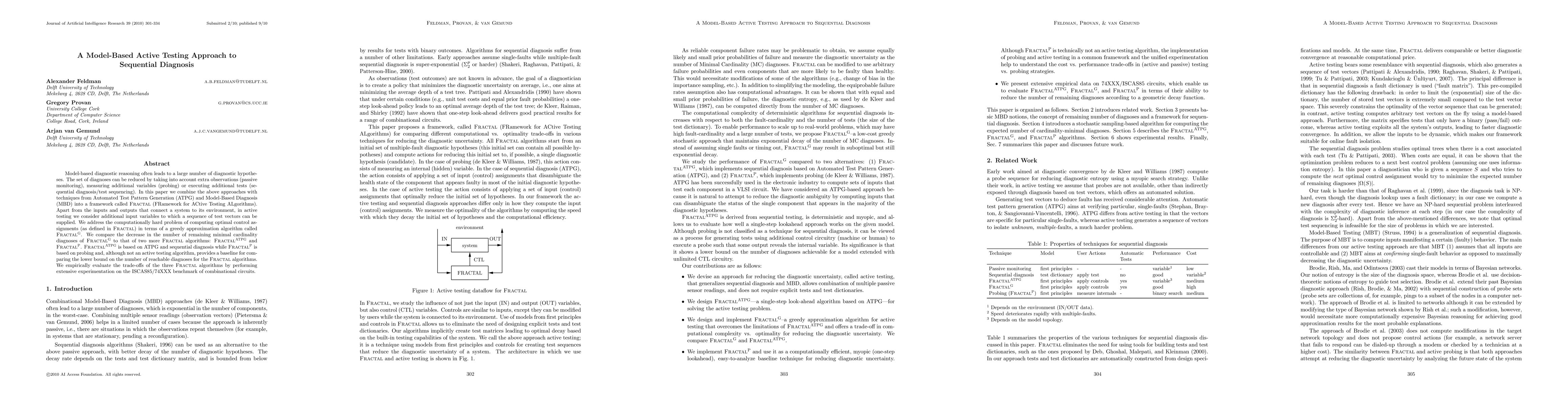 Model-based diagnostic reasoning often leads to a large number of diagnostic hypotheses. The set of diagnoses can be reduced by taking into account extra observations (passive monitoring), measuring additional variables (probing) or executing additional tests (sequential diagnosis/test sequencing). In this paper we combine the above approaches with techniques from Automated Test Pattern Generation (ATPG) and Model-Based Diagnosis (MBD) into a framework called FRACTAL (FRamework for ACtive Testing ALgorithms). Apart from the inputs and outputs that connect a system to its environment, in active testing we consider additional input variables to which a sequence of test vectors can be supplied. We address the computationally hard problem of computing optimal control assignments (as defined in FRACTAL) in terms of a greedy approximation algorithm called FRACTAL-G. We compare the decrease in the number of remaining minimal cardinality diagnoses of FRACTAL-G to that of two more FRACTAL algorithms: FRACTAL-ATPG and FRACTAL-P. FRACTAL-ATPG is based on ATPG and sequential diagnosis while FRACTAL-P is based on probing and, although not an active testing algorithm, provides a baseline for comparing the lower bound on the number of reachable diagnoses for the FRACTAL algorithms. We empirically evaluate the trade-offs of the three FRACTAL algorithms by performing extensive experimentation on the ISCAS85/74XXX benchmark of combinational circuits.