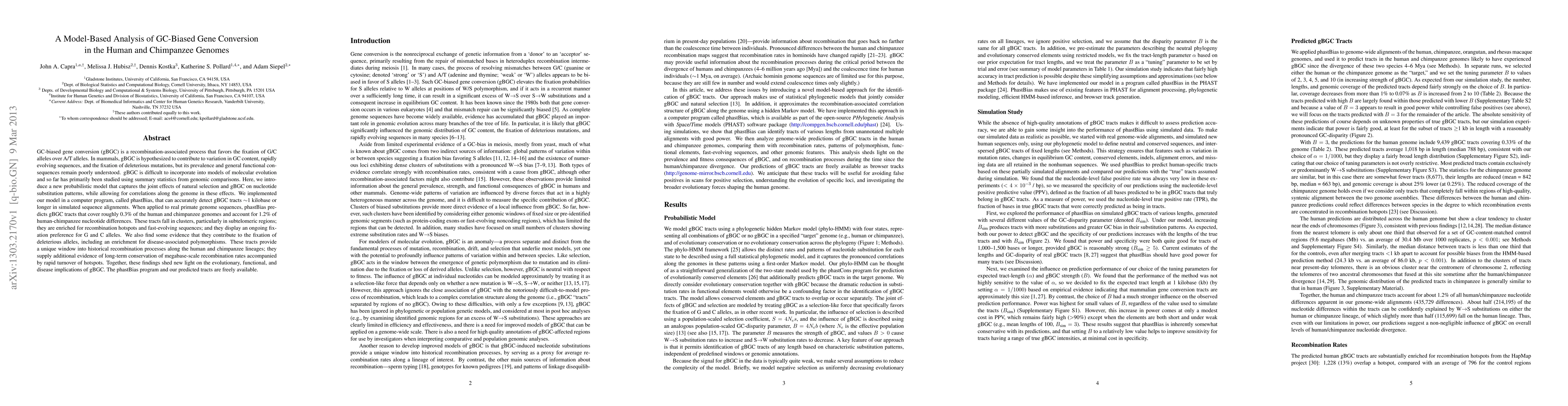 This paper introduces a new probabilistic model, phastBias, to detect GC-biased gene conversion (gBGC) tracts in human and chimpanzee genomes, revealing that gBGC affects approximately 0.3% of these genomes and contributes to the fixation of G/C alleles, potentially including deleterious mutations.