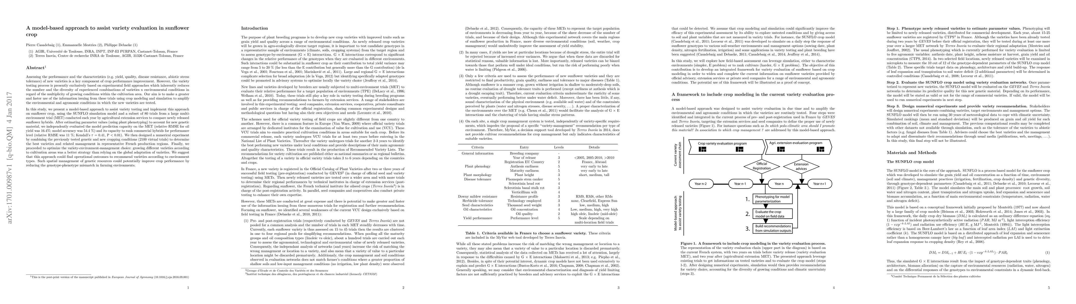 Assessing the performance and the characteristics (e.g. yield, quality, disease resistance, abiotic stress tolerance) of new varieties is a key component of crop performance improvement. However, the variety testing process is presently exclusively based on experimental field approaches which inherently reduces the number and the diversity of experienced combinations of varieties x environmental conditions in regard of the multiplicity of growing conditions within the cultivation area. Our aim is to make a greater and faster use of the information issuing from these trials using crop modeling and simulation to amplify the environmental and agronomic conditions in which the new varieties are tested. In this study, we present a model-based approach to assist variety testing and implement this approach on sunflower crop, using the SUNFLO simulation model and a subset of 80 trials from a large multi-environment trial (MET) conducted each year by agricultural extension services to compare newly released sunflower hybrids. After estimating parameter values (using plant phenotyping) to account for new genetic material, we independently evaluated the model prediction capacity on the MET (model accuracy was 54.4 %) and its capacity to rank commercial hybrids for performance level (Kendall's $\tau$ = 0.41, P < 0.01). We then designed a numerical experiment by combining the previously tested genetic and new cropping conditions (2100 virtual trials) to determine the best varieties and related management in representative French production regions. We suggest that this approach could find operational outcomes to recommend varieties according to environment types. Such spatial management of genetic resources could potentially improve crop performance by reducing the genotype-phenotype mismatch in farming environments.