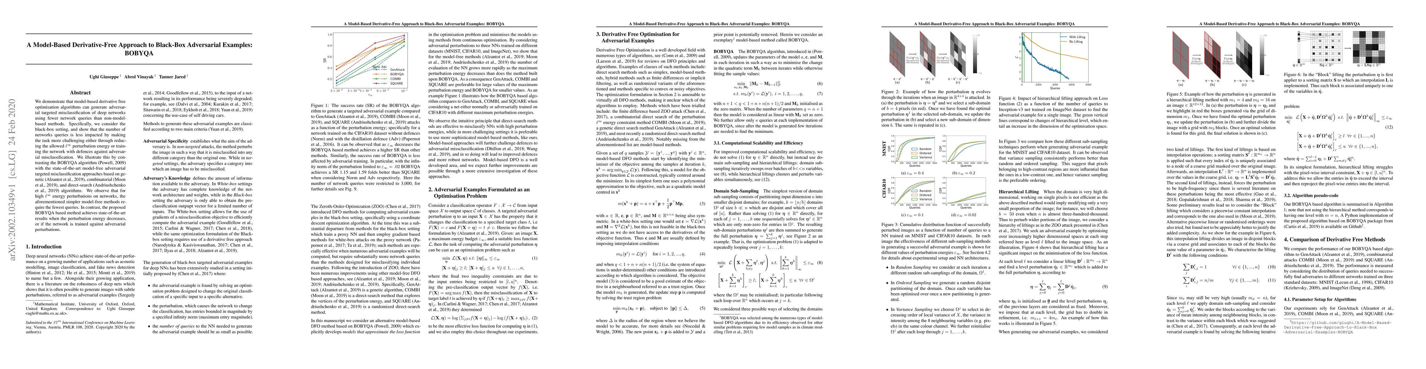 We demonstrate that model-based derivative free optimisation algorithms can generate adversarial targeted misclassification of deep networks using fewer network queries than non-model-based methods. Specifically, we consider the black-box setting, and show that the number of networks queries is less impacted by making the task more challenging either through reducing the allowed $\ell^{\infty}$ perturbation energy or training the network with defences against adversarial misclassification. We illustrate this by contrasting the BOBYQA algorithm with the state-of-the-art model-free adversarial targeted misclassification approaches based on genetic, combinatorial, and direct-search algorithms. We observe that for high $\ell^{\infty}$ energy perturbations on networks, the aforementioned simpler model-free methods require the fewest queries. In contrast, the proposed BOBYQA based method achieves state-of-the-art results when the perturbation energy decreases, or if the network is trained against adversarial perturbations.