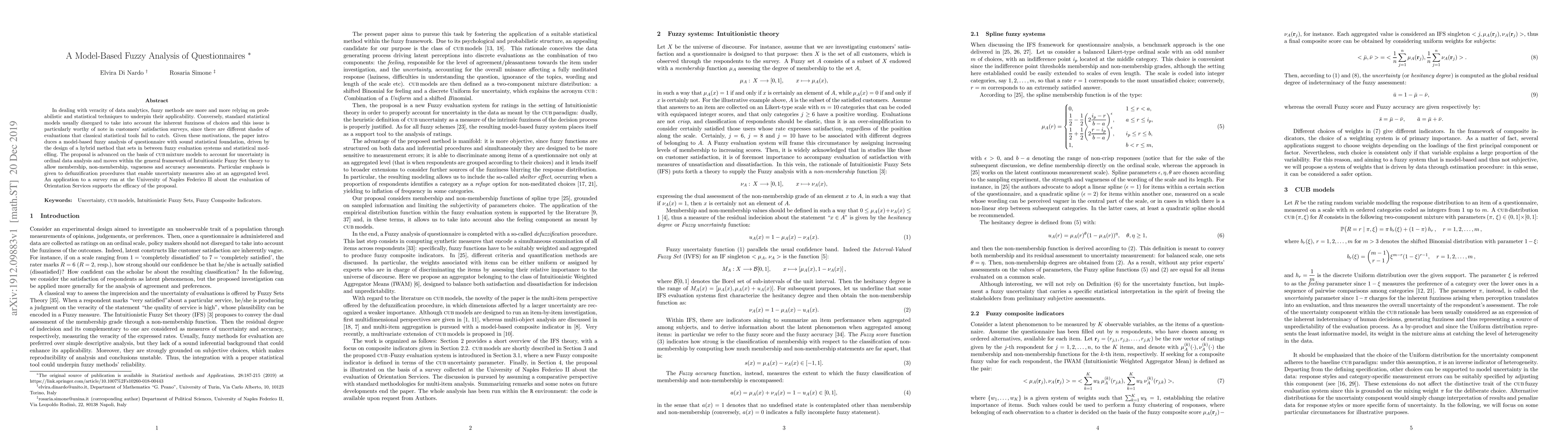 In dealing with veracity of data analytics, fuzzy methods are more and more relying on probabilistic and statistical techniques to underpin their applicability. Conversely, standard statistical models usually disregard to take into account the inherent fuzziness of choices and this issue is particularly worthy of note in customers' satisfaction surveys, since there are different shades of evaluations that classical statistical tools fail to catch. Given these motivations, the paper introduces a model-based fuzzy analysis of questionnaire with sound statistical foundation, driven by the design of a hybrid method that sets in between fuzzy evaluation systems and statistical modelling. The proposal is advanced on the basis of \cub mixture models to account for uncertainty in ordinal data analysis and moves within the general framework of Intuitionistic Fuzzy Set theory to allow membership, non-membership, vagueness and accuracy assessments. Particular emphasis is given to defuzzification procedures that enable uncertainty measures also at an aggregated level. An application to a survey run at the University of Naples Federico II about the evaluation of Orientation Services supports the efficacy of the proposal.
