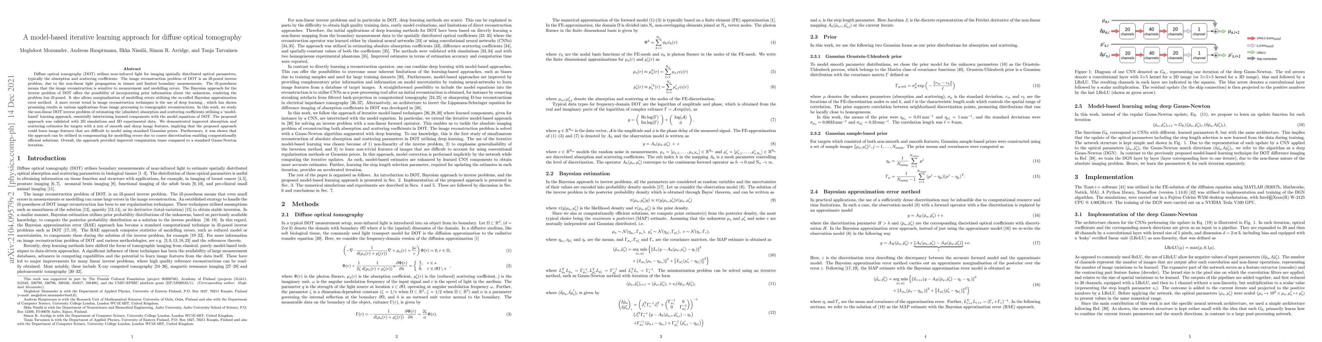 This paper proposes a model-based iterative learning approach for diffuse optical tomography (DOT) to estimate absorption and scattering coefficients, combining model equations with learned components. The method demonstrated improved estimates and efficiency, especially for complex image features, and showed potential for compensating for modelling errors.