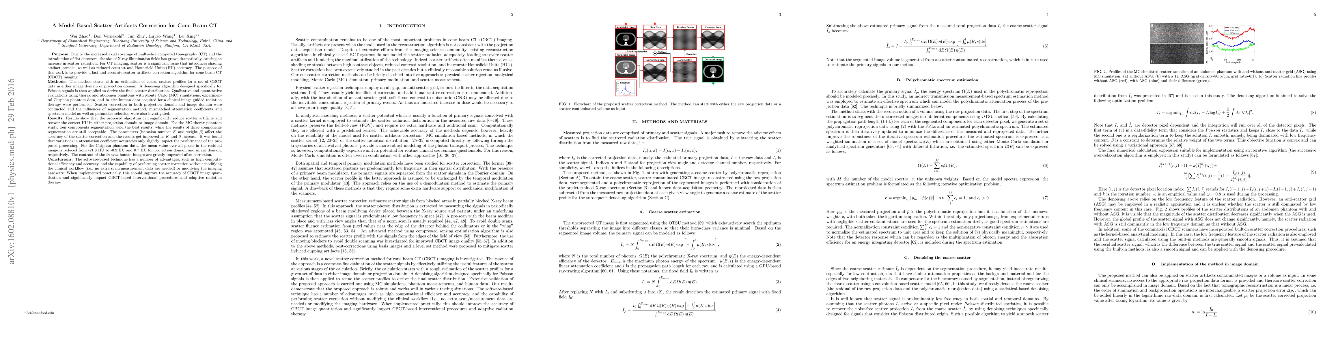 This paper proposes a fast and accurate scatter artifacts correction algorithm for cone beam CT (CBCT) imaging, significantly reducing scatter artifacts and improving image quantitation. The method uses a denoising algorithm for Poisson signals and shows high computational efficiency and accuracy, enhancing the contrast of in vivo human images.
