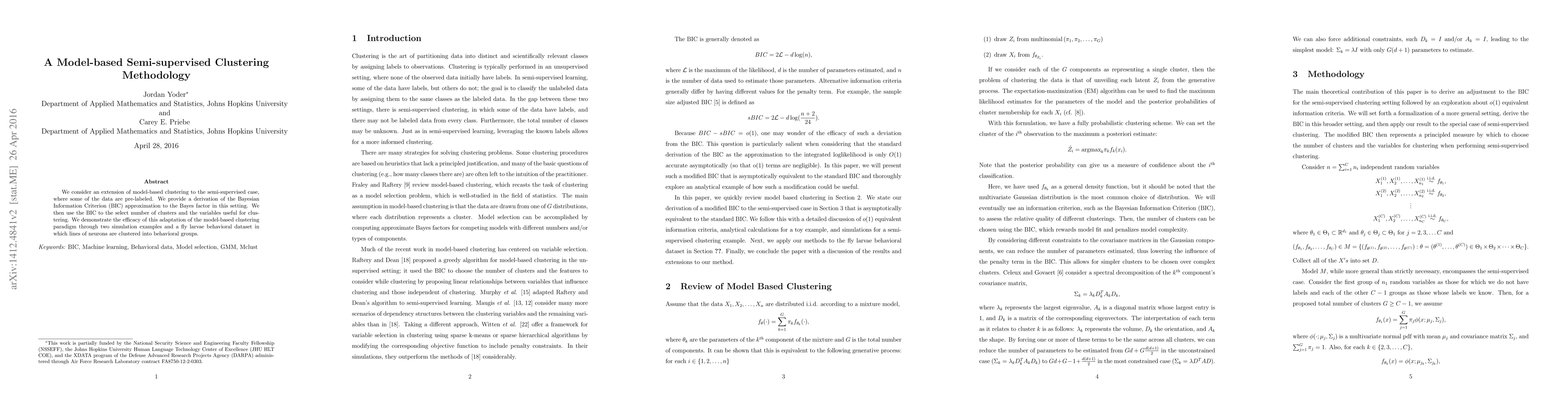 We consider an extension of model-based clustering to the semi-supervised case, where some of the data are pre-labeled. We provide a derivation of the Bayesian Information Criterion (BIC) approximation to the Bayes factor in this setting. We then use the BIC to the select number of clusters and the variables useful for clustering. We demonstrate the efficacy of this adaptation of the model-based clustering paradigm through two simulation examples and a fly larvae behavioral dataset in which lines of neurons are clustered into behavioral groups.