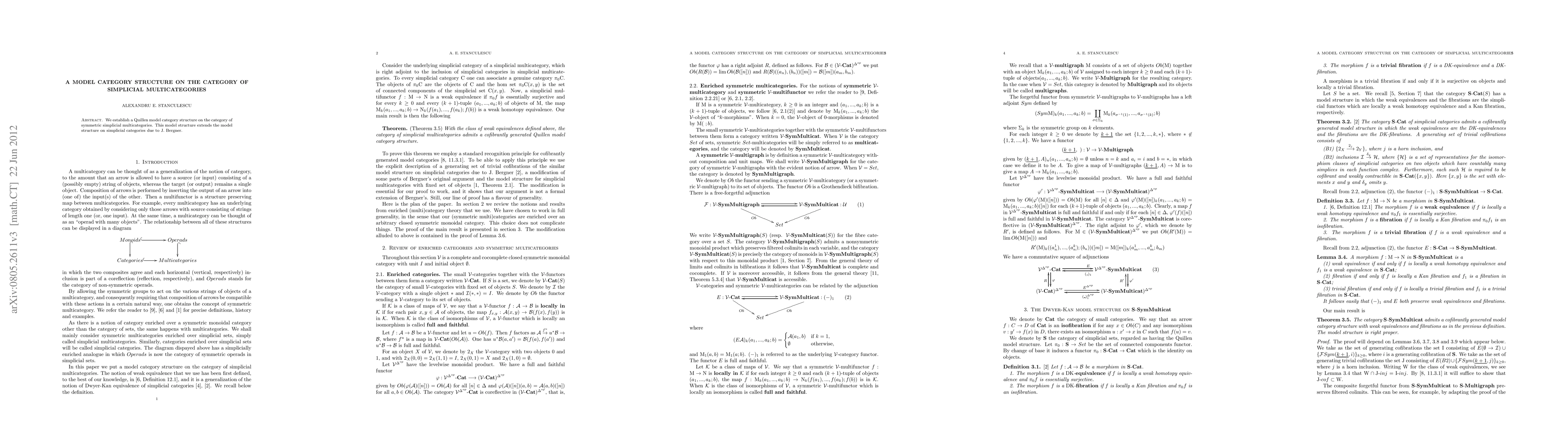 Summary: This paper introduces a Quillen model category structure on the category of symmetric simplicial multicategories, extending the existing model structure for simplicial categories. This provides a framework for homotopical algebra in multicategories.