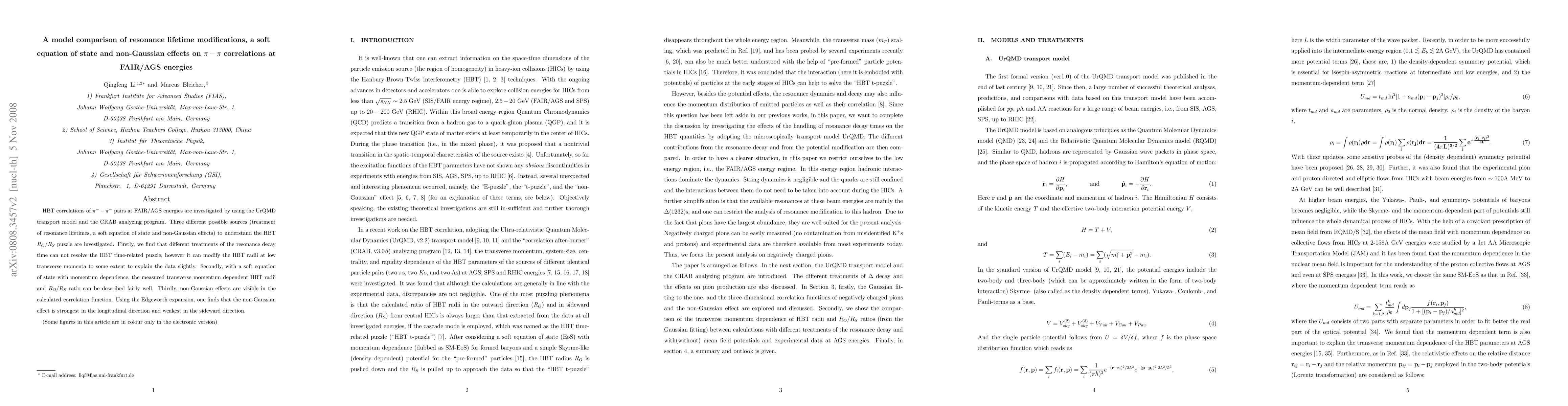 The study uses the UrQMD transport model and CRAB program to analyze $pi^--pi^-$ HBT correlations at FAIR/AGS energies. It finds that while varied resonance decay treatments slightly modify HBT radii, they don't resolve the time-related puzzle. A soft equation of state with momentum dependence successfully describes measured HBT radii and $R_O/R_S$ ratio. Non-Gaussian effects, strongest in the longitudinal direction, are also visible in the correlation function.
