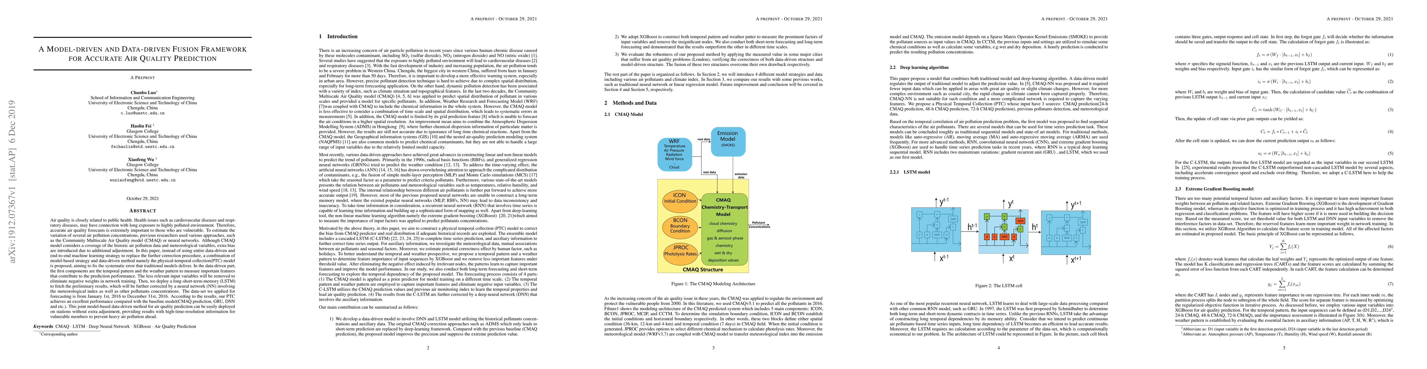 This paper proposes a fusion framework, PTC, that combines model-driven (CMAQ model) and data-driven (LSTM and XGBoost) approaches for accurate air quality prediction, addressing systematic errors in traditional models and improving prediction performance by eliminating irrelevant input variables and correcting biases using meteorological data.