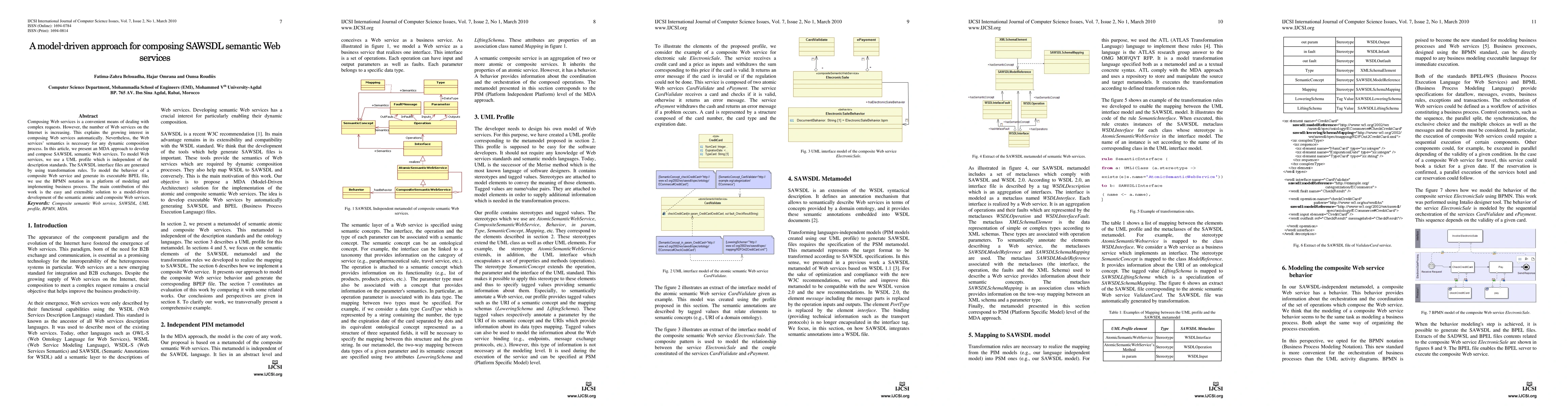 The paper presents a model-driven architecture (MDA) approach for developing and composing SAWSDL semantic Web services using UML profiles, transformation rules, and BPMN for behavior modeling.