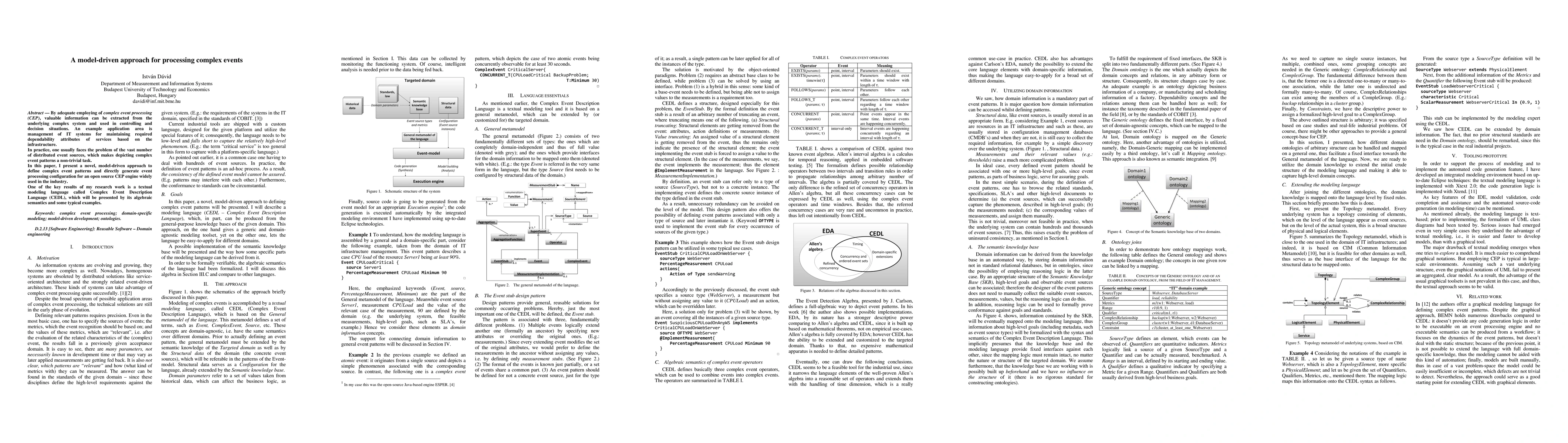 This paper introduces a model-driven approach for defining complex event patterns and generating event processing configurations for a CEP engine. The key contribution is the Complex Event Description Language (CEDL), which provides a textual modeling language with algebraic semantics to handle the complexity of distributed event sources.