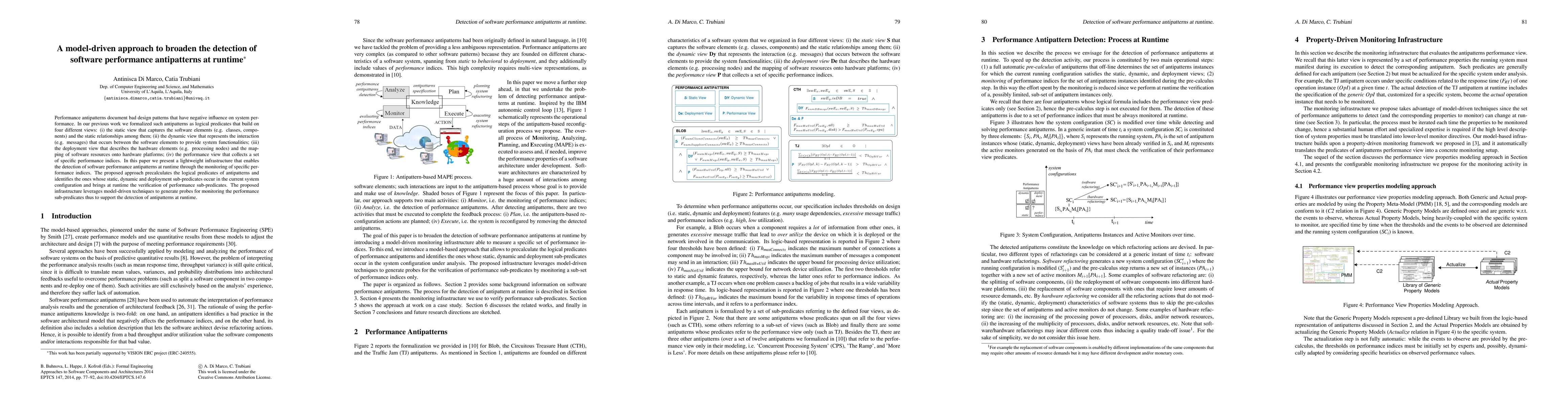 This paper introduces a model-driven infrastructure for detecting software performance antipatterns in real-time by monitoring system configurations and performance indices. It leverages precalculated logical predicates based on static, dynamic, deployment, and performance views to identify and verify antipatterns during runtime.