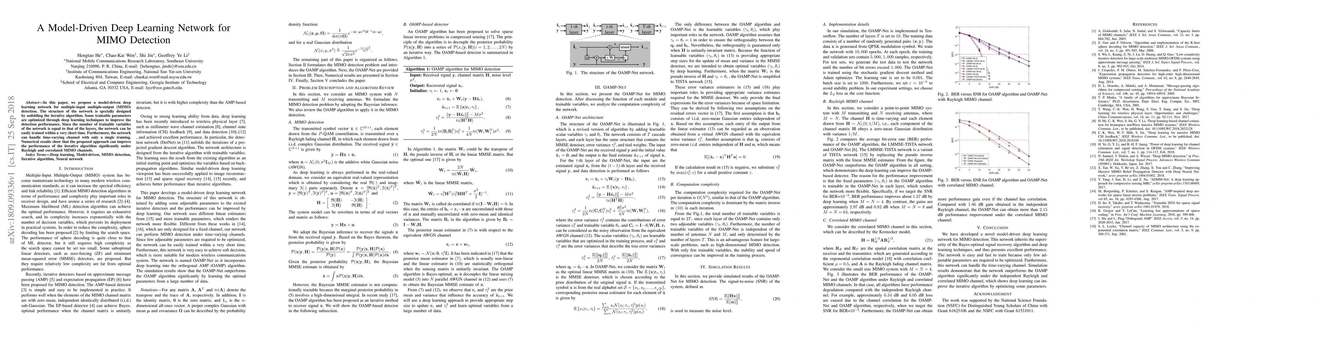 This paper proposes a model-driven deep learning network for MIMO detection, designed by unfolding the iterative algorithm, which optimizes trainable parameters to enhance detection performance. The network's efficiency allows for rapid training and effective handling of time-varying channels, significantly improving iterative algorithm performance under Rayleigh and correlated MIMO channels.