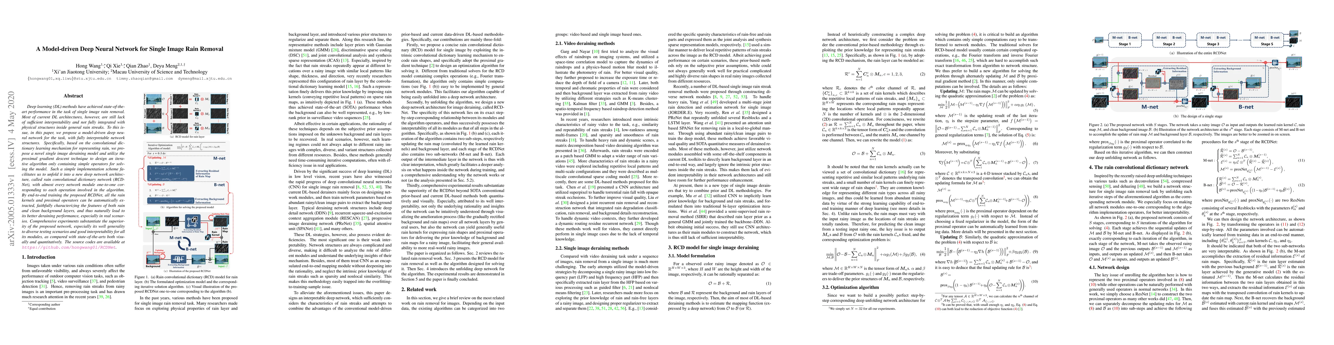 This paper proposes a model-driven deep neural network, Rain Convolutional Dictionary Network (RCDNet), for single image rain removal, integrating convolutional dictionary learning with proximal gradient descent for interpretable and efficient deraining. The network's modules correspond directly to the algorithm's operations, leading to superior performance and generalizability.