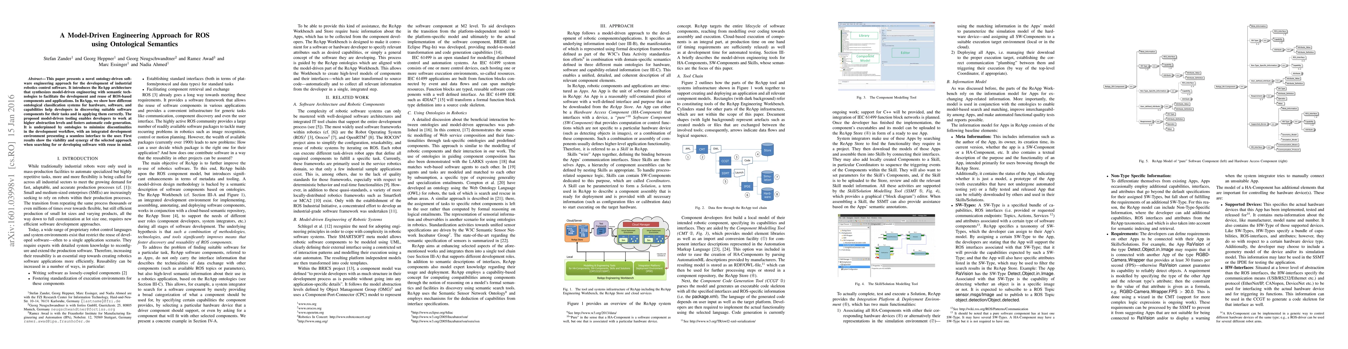 This paper introduces ReApp, a model-driven engineering framework for developing ROS-based robotics control software using ontological semantics. It facilitates component discovery and reuse, and enables automatic code generation through high-level abstractions, minimizing workflow discontinuities.
