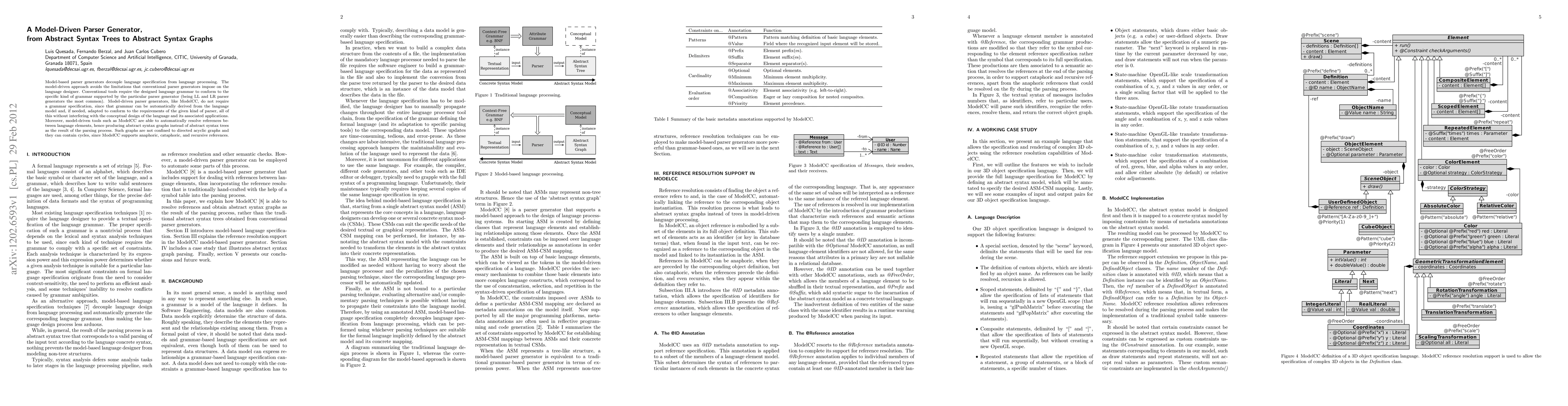 This paper introduces a model-driven parser generator that derives grammar from language models, eliminating the need for predefined grammars and enabling the creation of abstract syntax graphs that support cycles and references. ModelCC exemplifies this approach, offering flexibility in language design and parsing.
