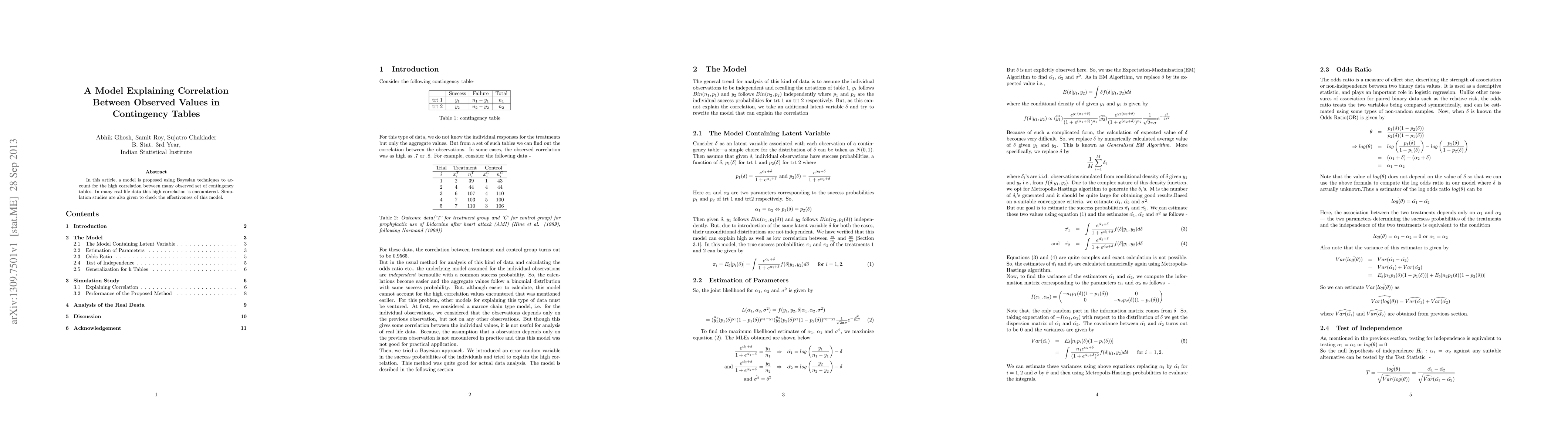 This paper proposes a Bayesian model to explain the high correlation observed in contingency tables, validated by simulation studies to assess its effectiveness. The model aims to address the common issue of correlation in real-life data sets.