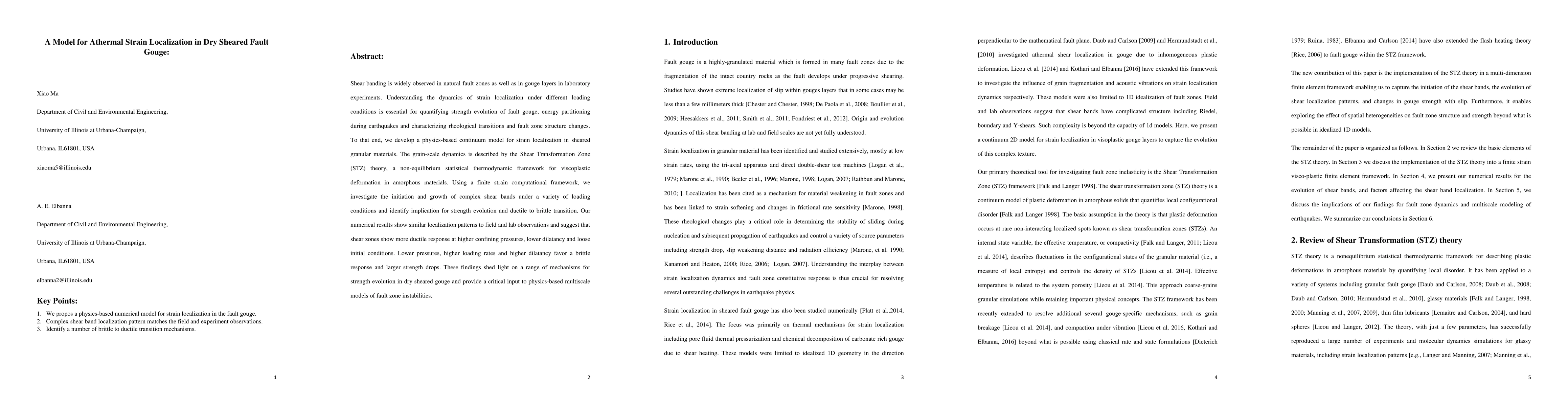 This paper develops a physics-based continuum model to study athermal strain localization in dry sheared fault gouge, using the Shear Transformation Zone theory. The model reveals that higher confining pressures lead to more ductile behavior, while lower pressures and higher loading rates promote brittleness and significant strength drops.