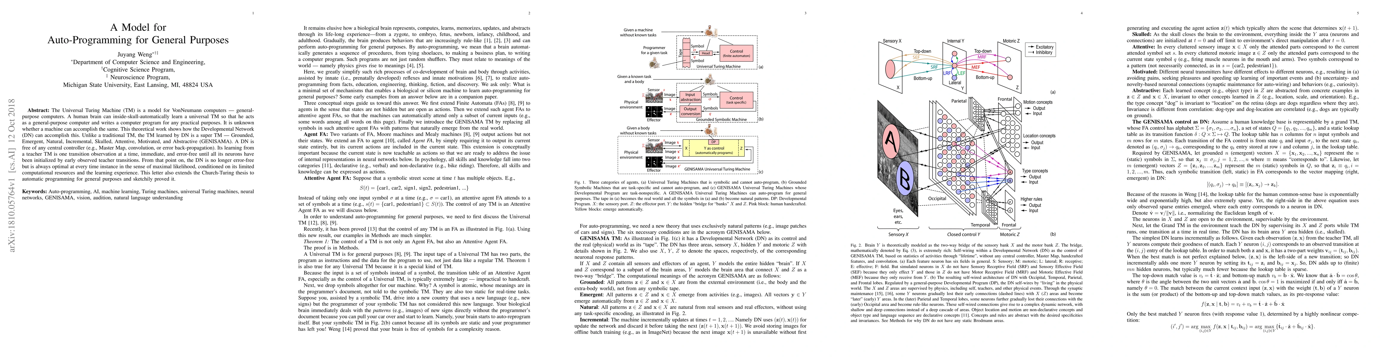 The Universal Turing Machine (TM) is a model for VonNeumann computers --- general-purpose computers. A human brain can inside-skull-automatically learn a universal TM so that he acts as a general-purpose computer and writes a computer program for any practical purposes. It is unknown whether a machine can accomplish the same. This theoretical work shows how the Developmental Network (DN) can accomplish this. Unlike a traditional TM, the TM learned by DN is a super TM --- Grounded, Emergent, Natural, Incremental, Skulled, Attentive, Motivated, and Abstractive (GENISAMA). A DN is free of any central controller (e.g., Master Map, convolution, or error back-propagation). Its learning from a teacher TM is one transition observation at a time, immediate, and error-free until all its neurons have been initialized by early observed teacher transitions. From that point on, the DN is no longer error-free but is always optimal at every time instance in the sense of maximal likelihood, conditioned on its limited computational resources and the learning experience. This letter also extends the Church-Turing thesis to automatic programming for general purposes and sketchily proved it.