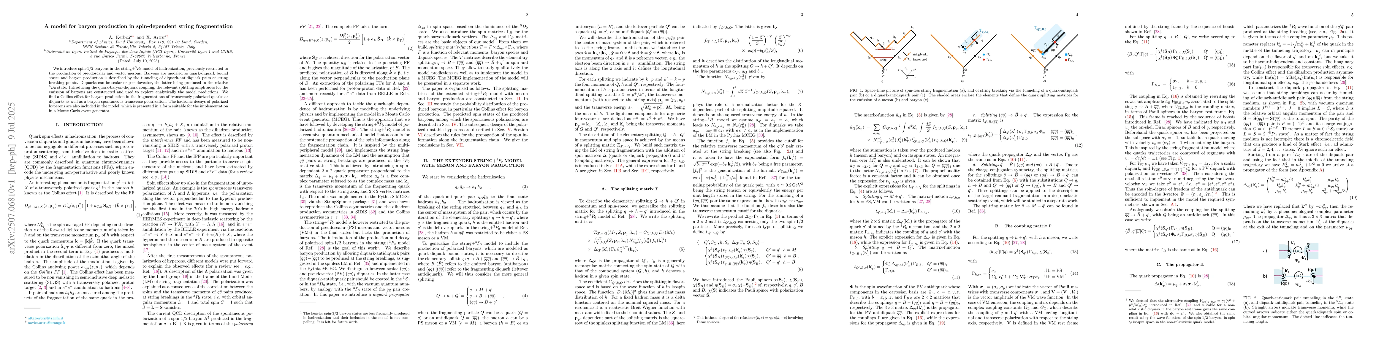 We introduce spin-1/2 baryons in the string+${}^3P_0$ model of hadronization, previously restricted to the production of pseudoscalar and vector mesons. Baryons are modeled as quark-diquark bound states and baryon production is described by the tunneling of diquark-antidiquark pairs at string breaking points. Diquarks can be scalar or pseudovector, the latter being produced in the relative ${}^5D_0$ state. Introducing the quark-baryon-diquark coupling, the relevant splitting amplitudes for the emission of baryons are constructed and used to explore analytically the model predictions. We find a Collins effect for baryon production in the fragmentations of transversely polarized quarks or diquarks as well as a baryon spontaneous transverse polarization. The hadronic decays of polarized hyperons are also included in the model, which is presented in a form suitable for the implementation in a Monte Carlo event generator.