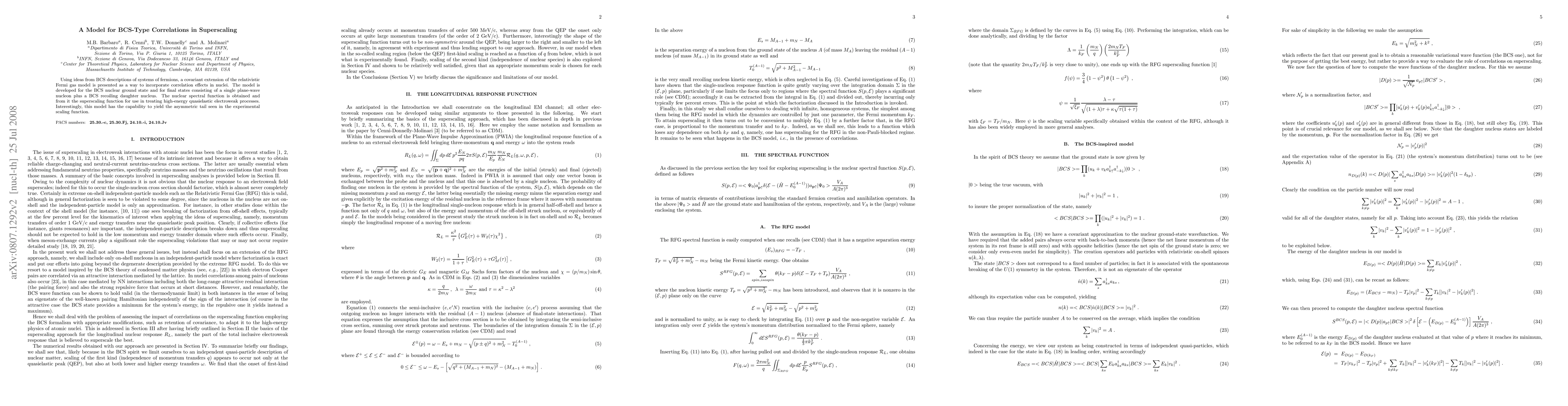 Using ideas from BCS descriptions of systems of fermions, a covariant extension of the relativistic Fermi gas model is presented as a way to incorporate correlation effects in nuclei. The model is developed for the BCS nuclear ground state and for final states consisting of a single plane-wave nucleon plus a BCS recoiling daughter nucleus. The nuclear spectral function is obtained and from it the superscaling function for use in treating high-energy quasielastic electroweak processes. Interestingly, this model has the capability to yield the asymmetric tail seen in the experimental scaling function.