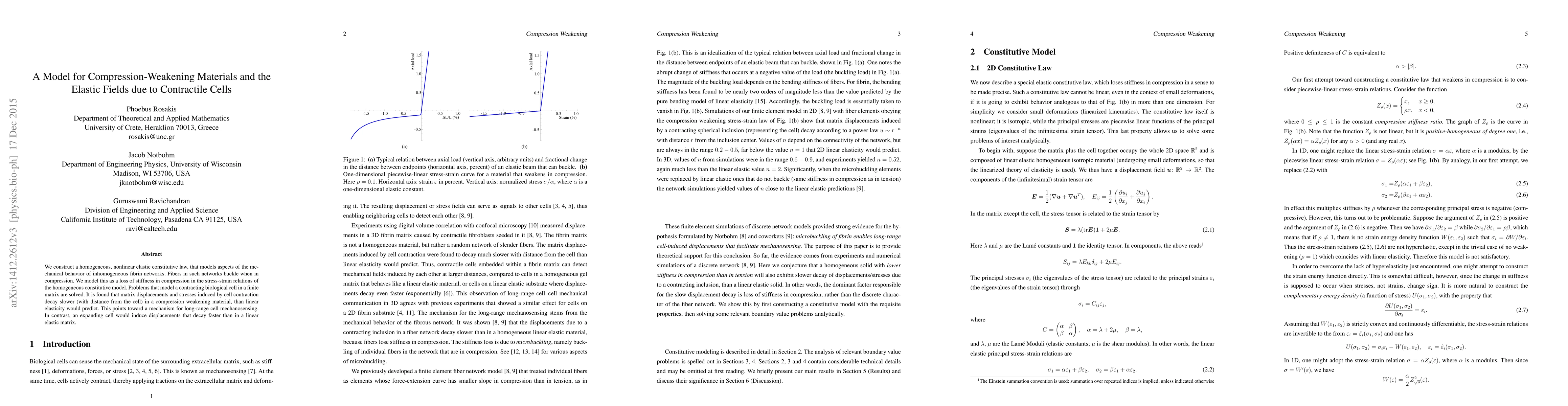 We construct a homogeneous, nonlinear elastic constitutive law, that models aspects of the mechanical behavior of inhomogeneous fibrin networks. Fibers in such networks buckle when in compression. We model this as a loss of stiffness in compression in the stress-strain relations of the homogeneous constitutive model. Problems that model a contracting biological cell in a finite matrix are solved. It is found that matrix displacements and stresses induced by cell contraction decay slower (with distance from the cell) in a compression weakening material, than linear elasticity would predict. This points toward a mechanism for long-range cell mechanosensing. In contrast, an expanding cell would induce displacements that decay faster than in a linear elastic matrix.