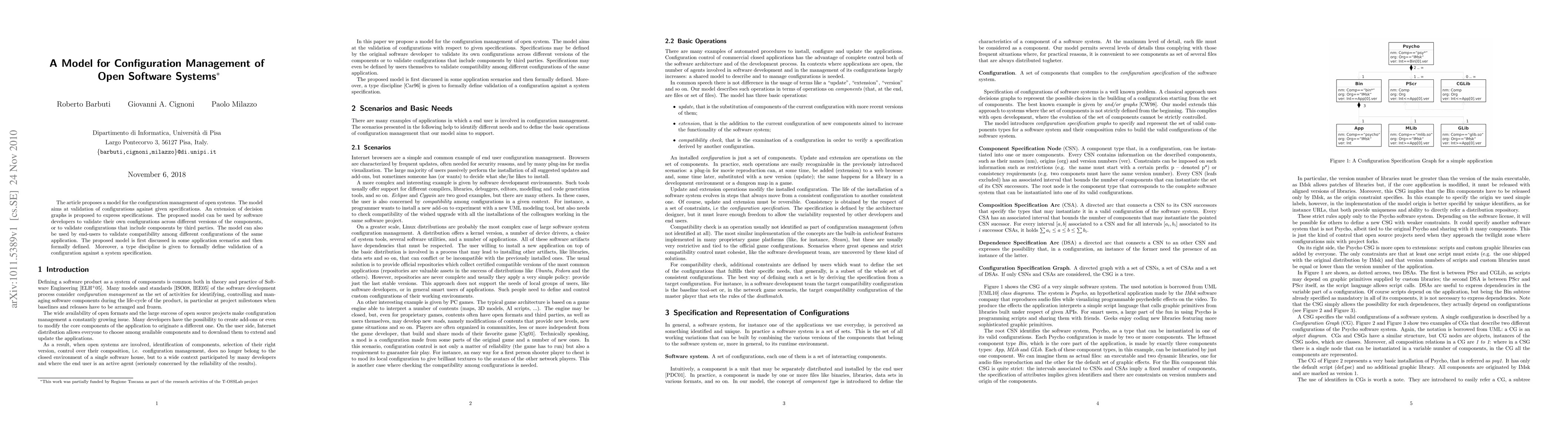 The article proposes a model for the configuration management of open systems. The model aims at validation of configurations against given specifications. An extension of decision graphs is proposed to express specifications. The proposed model can be used by software developers to validate their own configurations across different versions of the components, or to validate configurations that include components by third parties. The model can also be used by end-users to validate compatibility among different configurations of the same application. The proposed model is first discussed in some application scenarios and then formally defined. Moreover, a type discipline is given to formally define validation of a configuration against a system specification