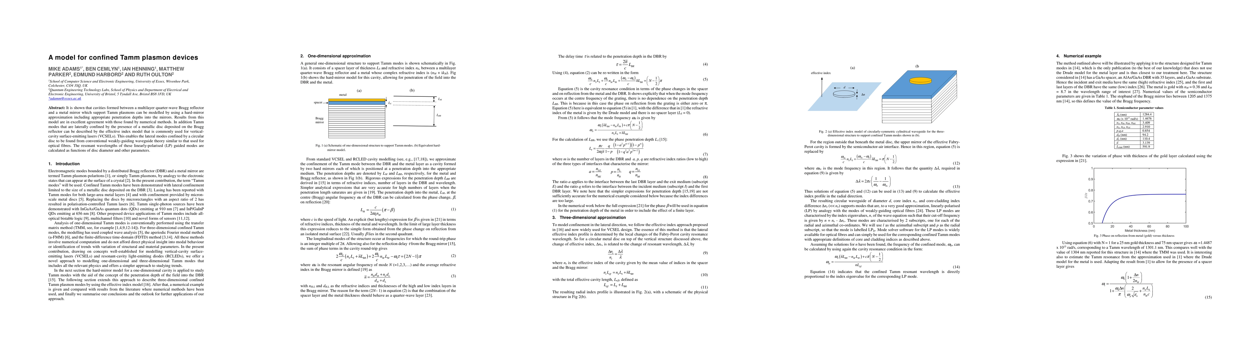 It is shown that cavities formed between a multilayer quarter-wave Bragg reflector and a metal mirror which support Tamm plasmons can be modelled by using a hard-mirror approximation including appropriate penetration depths into the mirrors. Results from this model are in excellent agreement with those found by numerical methods. In addition Tamm modes that are laterally confined by the presence of a metallic disc deposited on the Bragg reflector can be described by the effective index model that is commonly used for vertical-cavity surface-emitting lasers (VCSELs). This enables the lateral modes confined by a circular disc to be found from conventional weakly-guiding waveguide theory similar to that used for optical fibres. The resonant wavelengths of these linearly-polarised (LP) guided modes are calculated as functions of disc diameter and other parameters.