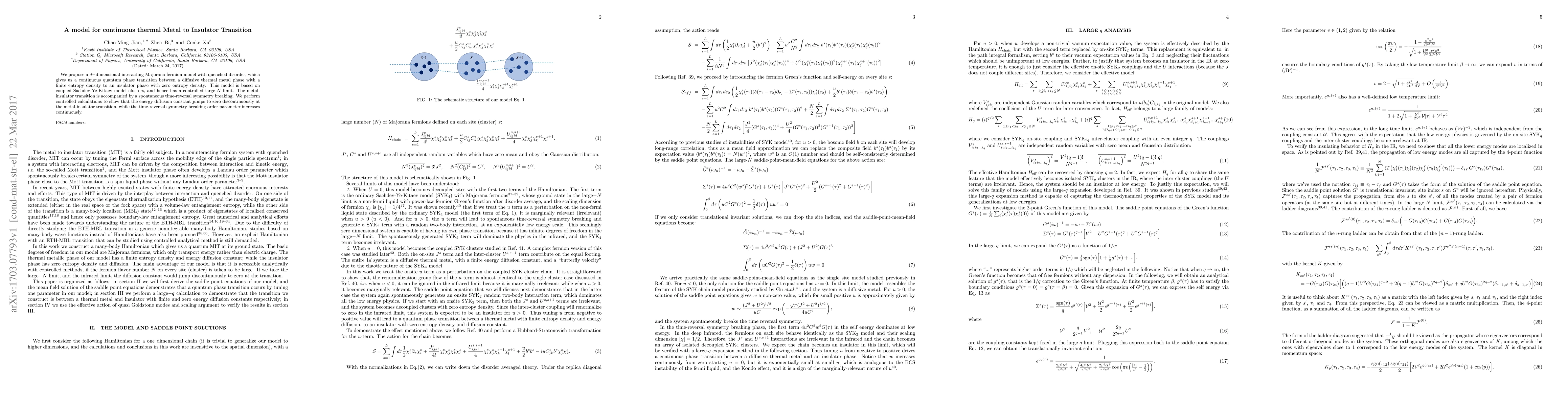 This research introduces a $d$-dimensional Majorana fermion model with disorder, demonstrating a continuous quantum phase transition from a thermal metal phase to an insulating phase, characterized by a discontinuous drop in diffusion and continuous time-reversal symmetry breaking. The model uses Sachdev-Ye-Kitaev clusters for a controlled large-$N$ limit.